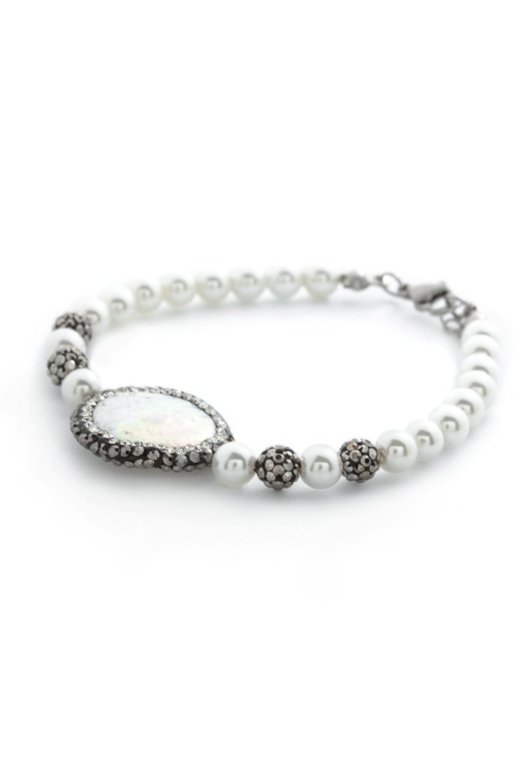 Bracelet en perles blanches avec élement central en nacre et cristaux gris, Longueur: 18 + 2 cm. Fermoir personnalisé avec logo. Garantie de 2 ans. Le produit est livré dans un boite avec logo.