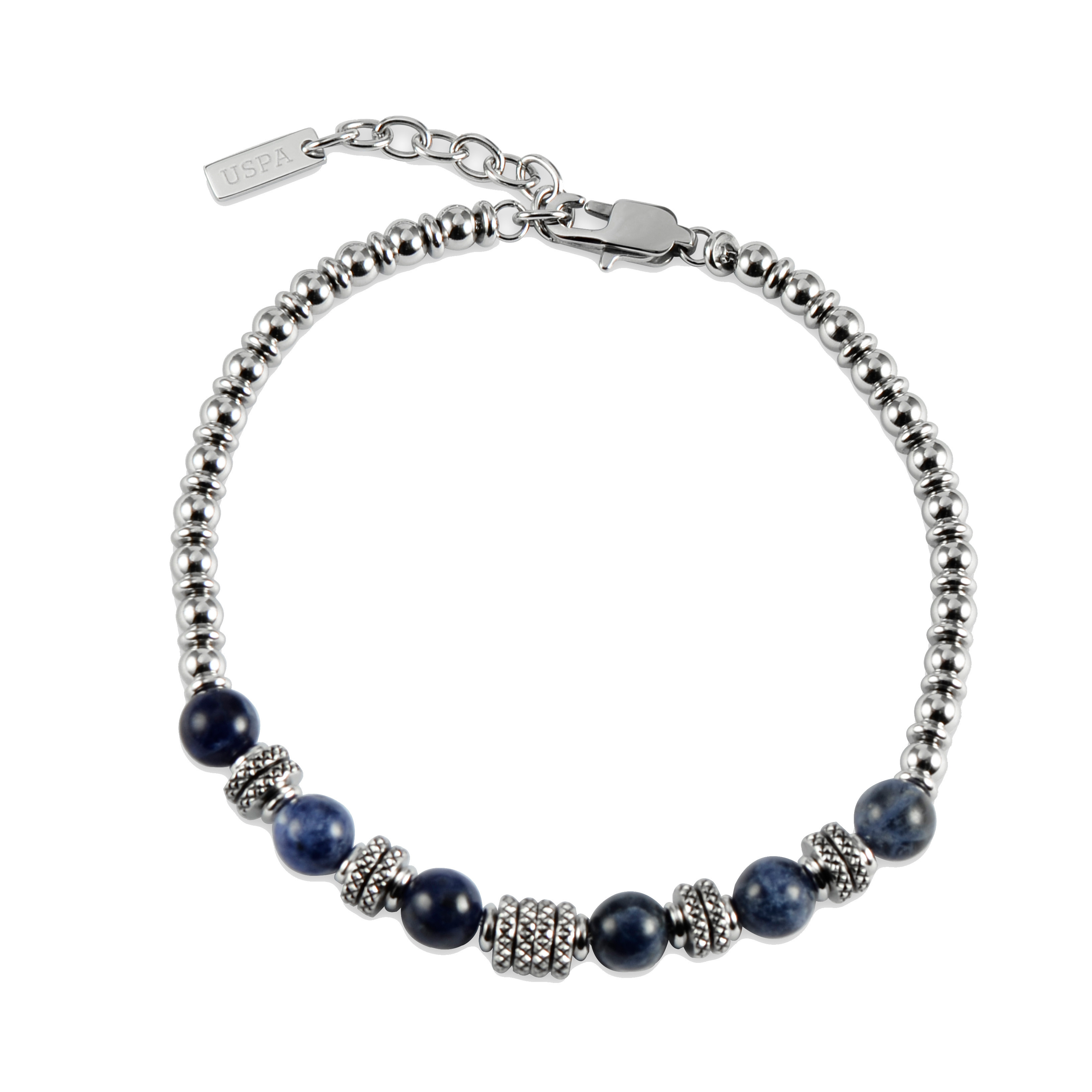 Bracelet en acier avec pierres de sodalite et bouchons en acier. Longueur: 20 cm. Plaque personnalisée avec logo. Garantie de 2 ans. Le produit est livré dans un boite avec logo.