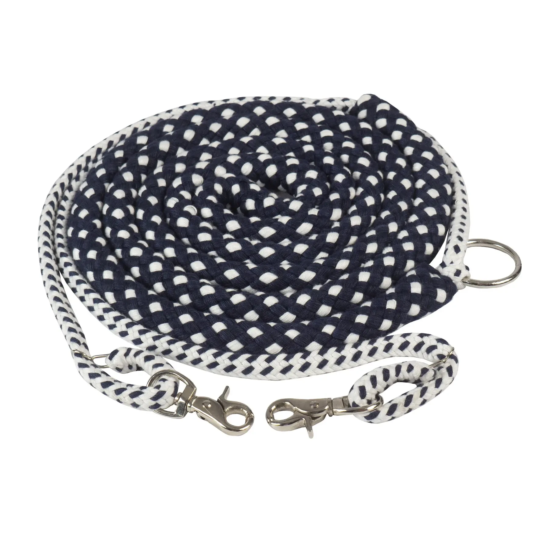 Aide à la longe en coton réglable. L'aide à la longe passe sur l'épaule, entre les antérieurs jusqu'à la tête. Spécifications du produit : - Attachez les clips aux anneaux de mors ou aux œillets du caparaçon - Les lignes sont maintenues ensemble par un anneau pour que le cheval ne s'emmêle pas dans la ligne - Les lignes sur l'épaule et entre les jambes sont recouvertes de coton doux et épais