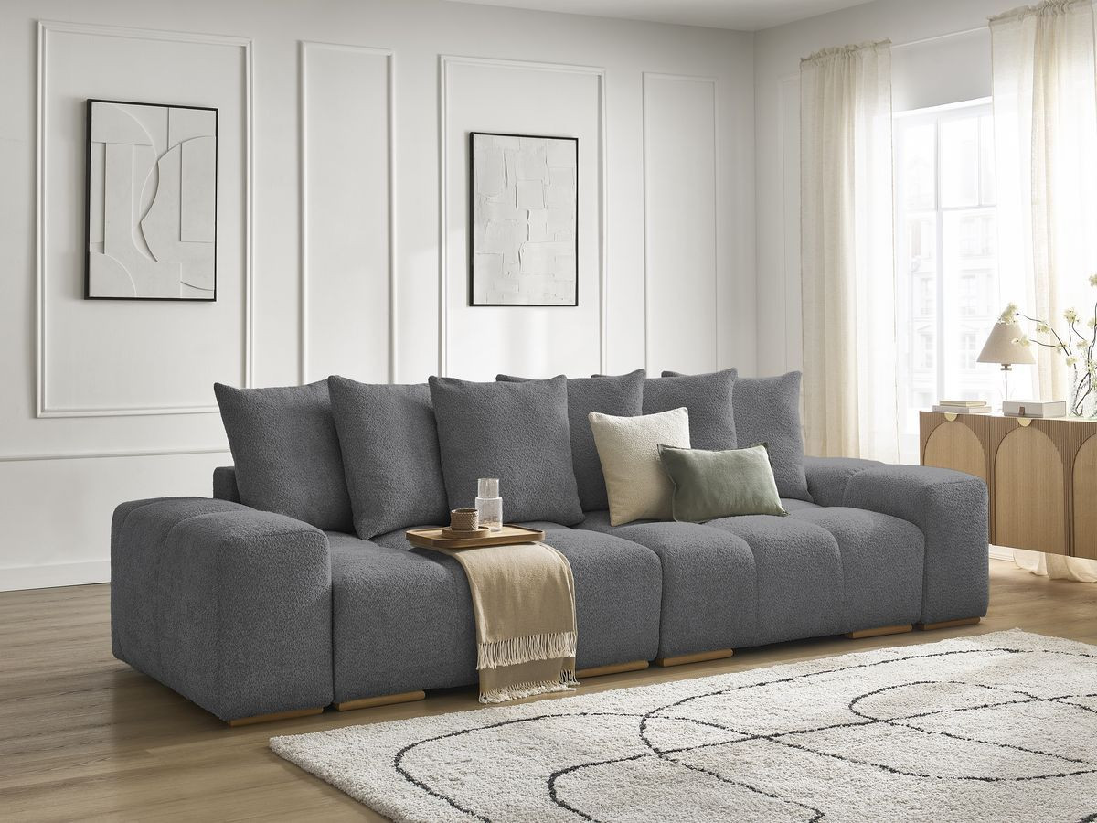 Pour cette nouvelle collection ANAKIN, nous avons fait le choix de la décliner en deux revêtements différents afin que vous puissiez personnaliser son visuel et son confort. Envie d'un intérieur doux et apaisant ? Créez-vous un espace chaleureux avec les canapés ANAKIN dans leur déclinaison en tissu bouclette. En effet, le tissu bouclette saura mettre en valeur les formes du canapé tout en vous proposant un charme cocooning inimitable. Avec son effet texturé et sa touche de douceur, le tissu bouclette est un revêtement qui fera de votre canapé un vrai cocoon de chaleur et un nid de confort !