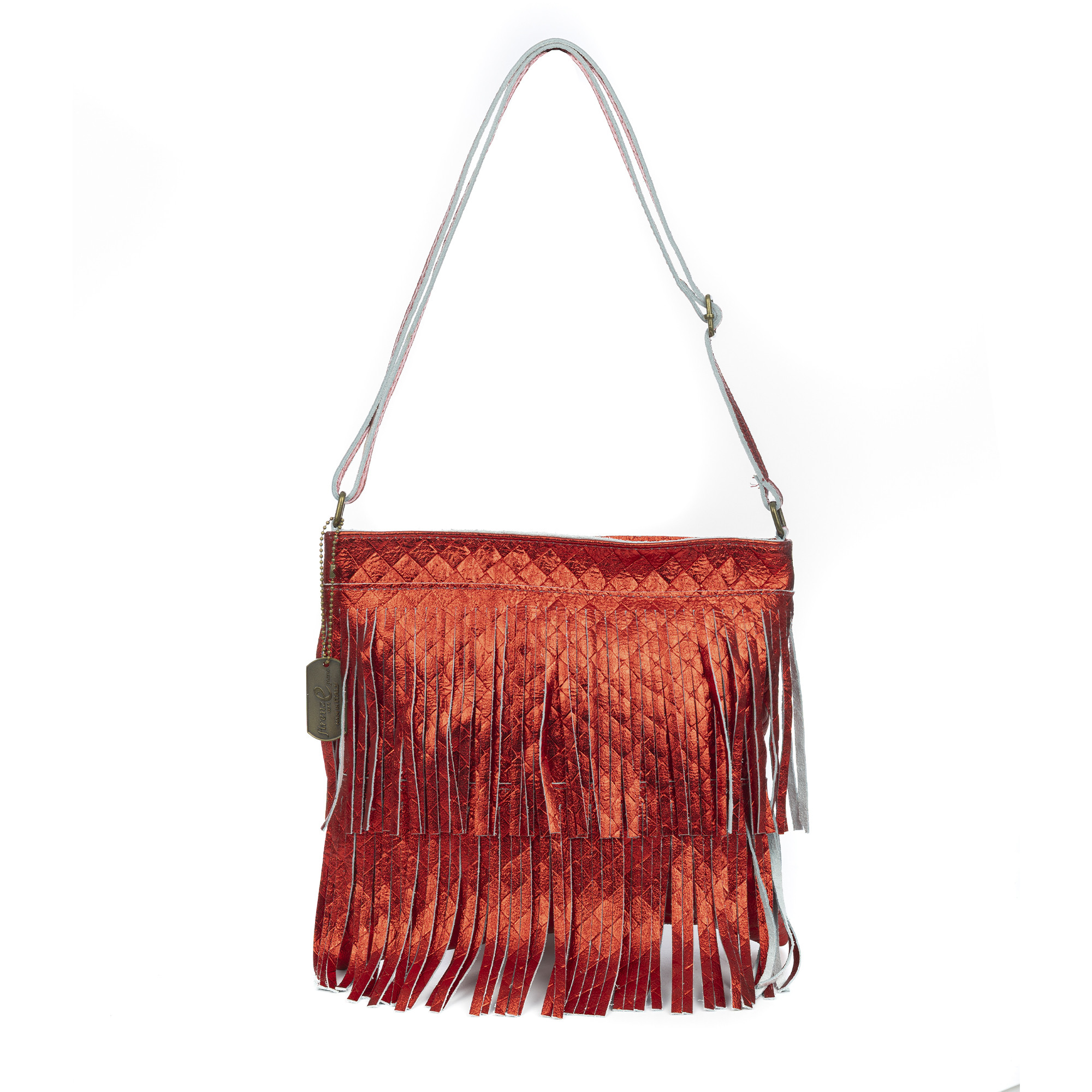 FIRENZE ARTEGIANI Sac bandoulière avec franges pour femme. Cuir authentique Daim laqué brillant. Fabriqué en Italie 30x7x26 Cm. Couleur : Rouge Sac bandoulière avec franges, en cuir suédé authentique verni brillant. Compartiment principal avec fermeture éclair. Poche arrière auxiliaire avec fermeture éclair. Intérieur recouvert de tissu, avec poches latérales auxiliaires avec fermeture à glissière. Sangle réglable. Fabriqué en ITALIE. Véritable cuir italien.