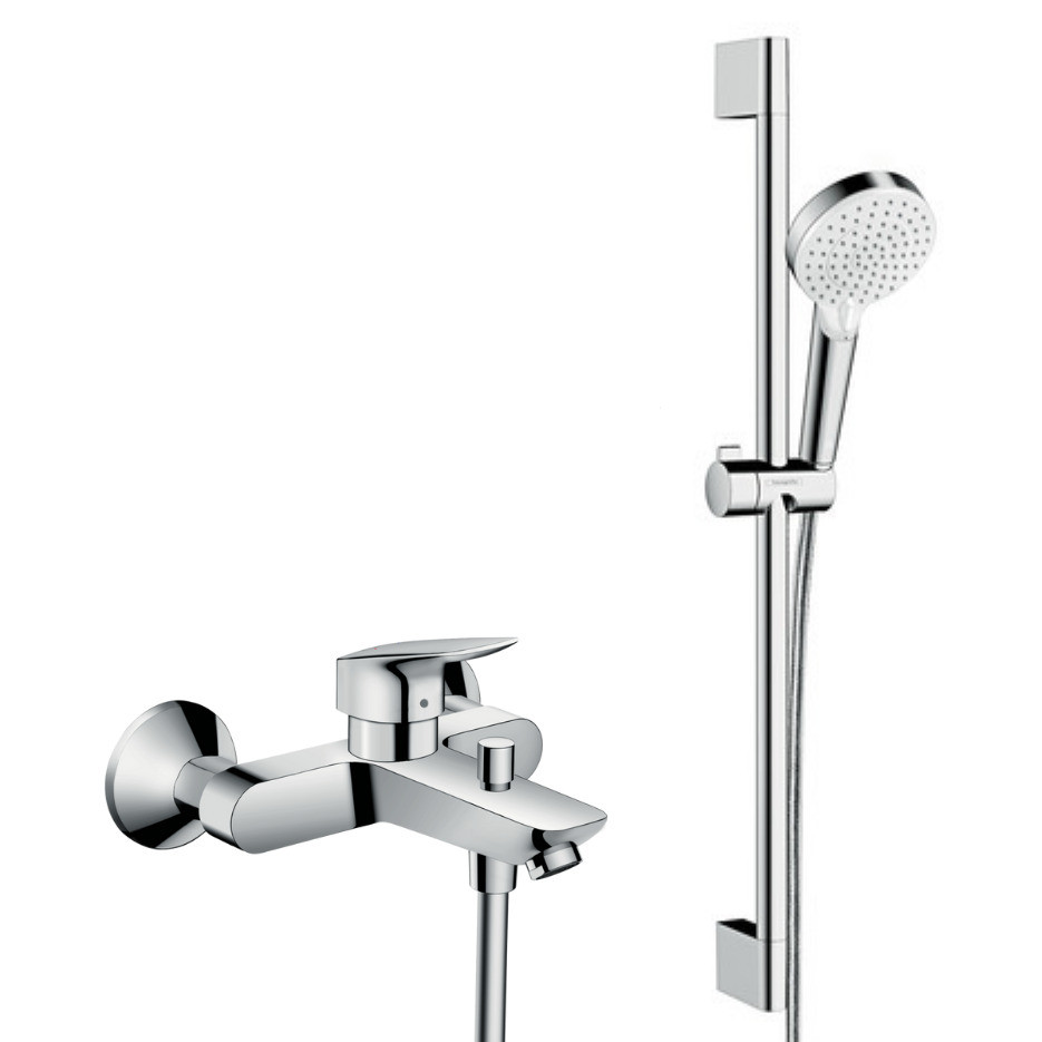 Hansgrohe Set bain/douche Mitigeur Logis + Douchette 2 jets + Barre de douche 65cm + Flexible, Chrome (71400000-CROMETTA-SP)