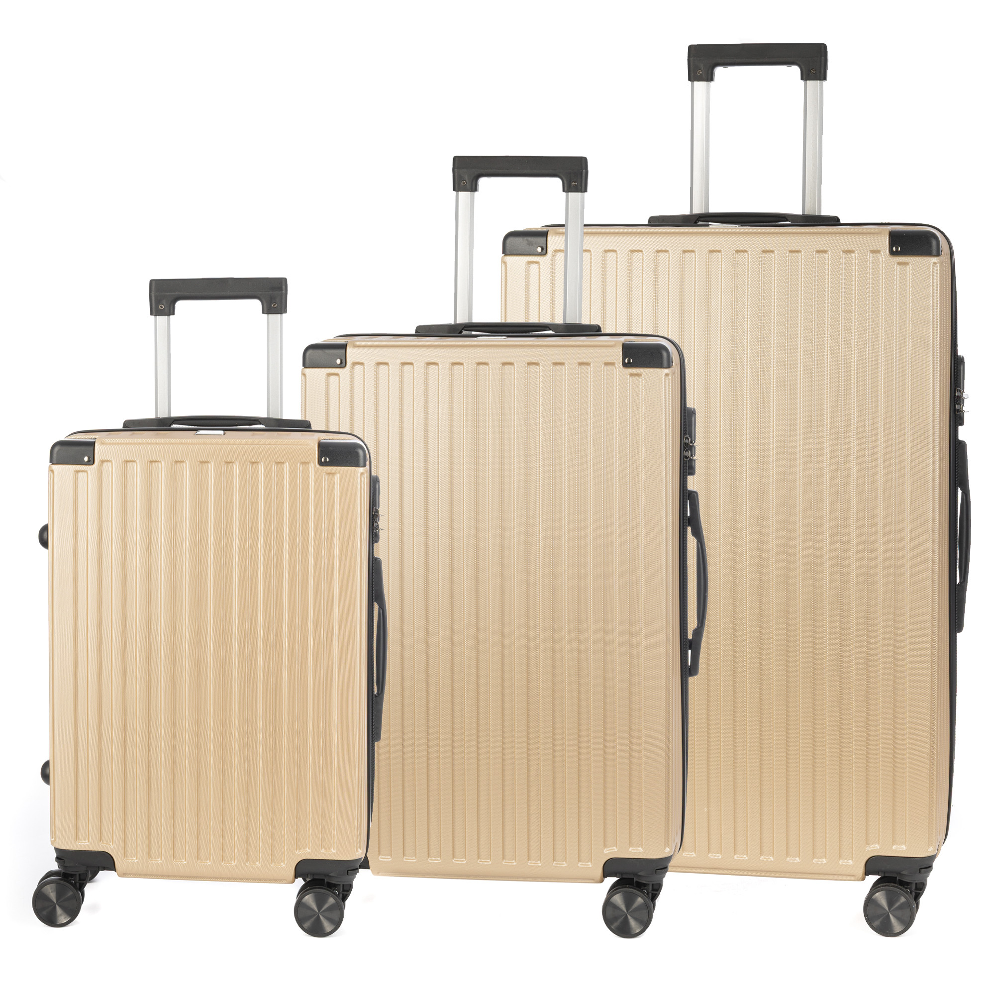 Jeu de 3 valises Trolley, en matériau léger ABS haute résistance avec coins renforcés. 4 roues doubles amovibles et pivotantes à 360°.