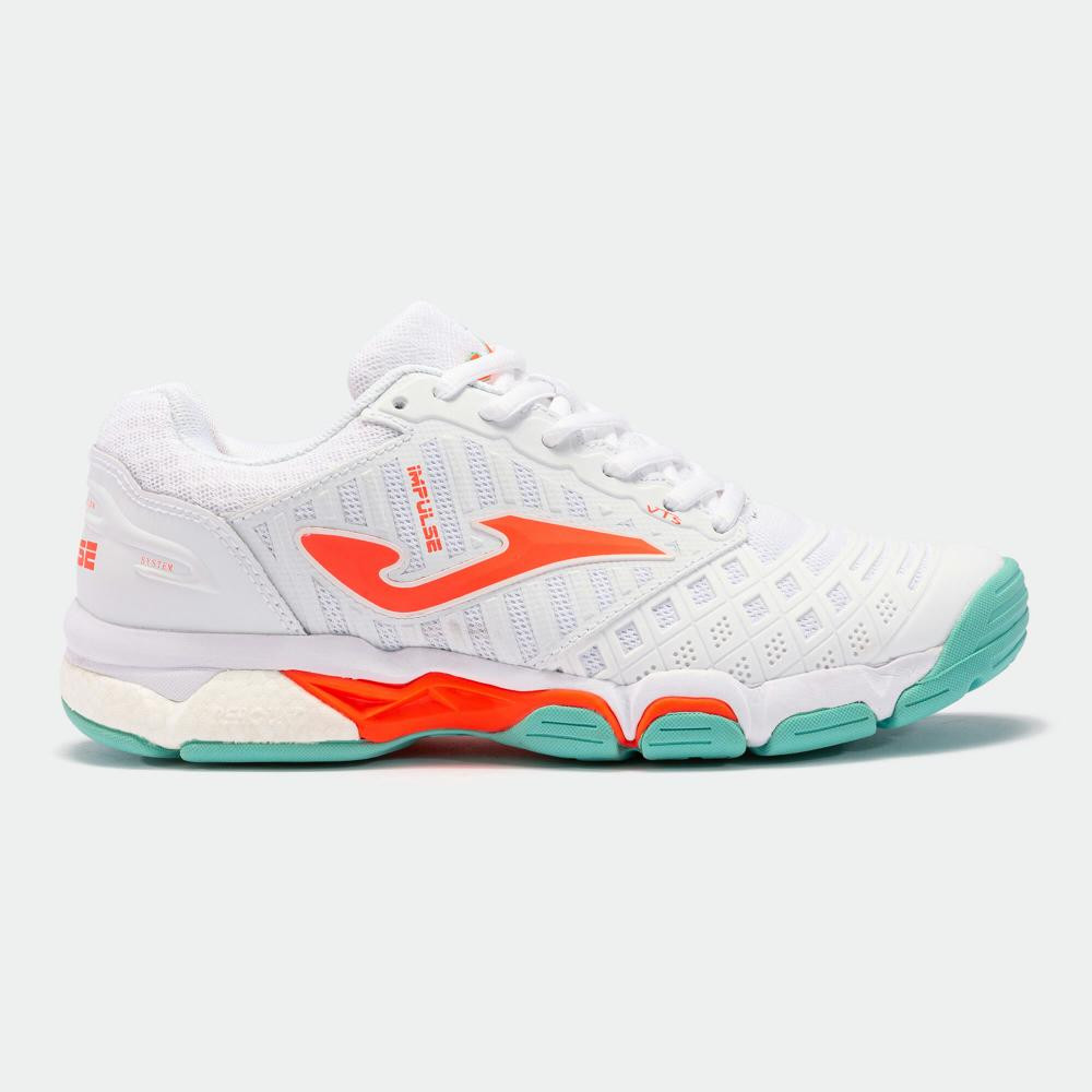 Chaussures de volley-ball techniques pour femme. Ces chaussures basses d'entraînement et de compétition polyvalentes offrent stabilité et amorti pour améliorer vos capacités en attaque et en défense. La tige a été fabriquée en grande partie avec un matériau synthétique appliqué avec différentes technologies. Le bout a été traité à l'aide de la technologie JOMA SPORTECH, qui vise à protéger la zone et qui est combinée avec du textile respirant. Sur les côtés, la matière synthétique est moins dense et comporte de petites perforations du système de ventilation VTS. Le talon est renforcé pour protéger cette zone. Et sur le dessus et la languette, une mousse intérieure a été ajoutée pour un ajustement plus confortable. La semelle intermédiaire a été réalisée avec une double densité de phylon à l'aide de la technologie à double amortissement FULL DUAL PULSOR. La partie supérieure est plus ferme pour plus de stabilité et la partie inférieure est réalisée avec la technologie REACTIVE BALL. Dans la partie centrale, il y a une pièce STABILIS, qui offre plus de stabilité et de soutien, clé pour éviter les blessures. La semelle extérieure est composée de caoutchouc DURABILITY de haute qualité. Pour faciliter les mouvements rotatifs en volley-ball, la semelle présente la structure ROTATION qui procure une grande sensation de confort lors des sauts et des déplacements latéraux. Et pour rendre la transition de la foulée plus dynamique, la semelle présente le système de lignes de flexion FLEXO à l'avant.