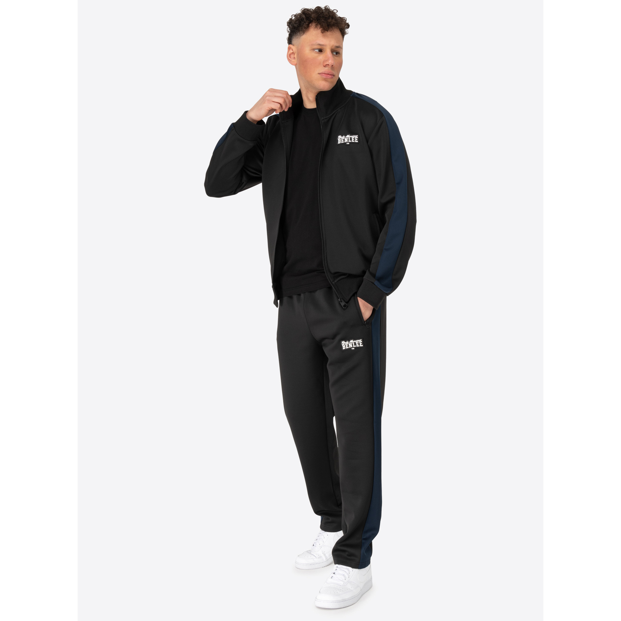 - Modèle : Survêtement composé d'une veste à zip intégral, col montant et pantalons longs de survêtement. Tous les bords de la veste ainsi que le col et la taille sont en matériau élastique en rib. La veste a des poches zippées ainsi qu'un badge 3D cousu sur la poitrine à gauche et un grand imprimé BENLEE contrastant dans le dos. Le look sportif est complété par des inserts contrastants sur les manches qui se fondent dans la jambe du pantalon. Le pantalon est équipé de deux poches zippées à l'avant et d'une poche plaquée à l'arrière. La jambe gauche du pantalon arbore le même logo 3D que la veste. - Qualité : 95 % polyester, 5 % élasthanne - Tissu : Interlock