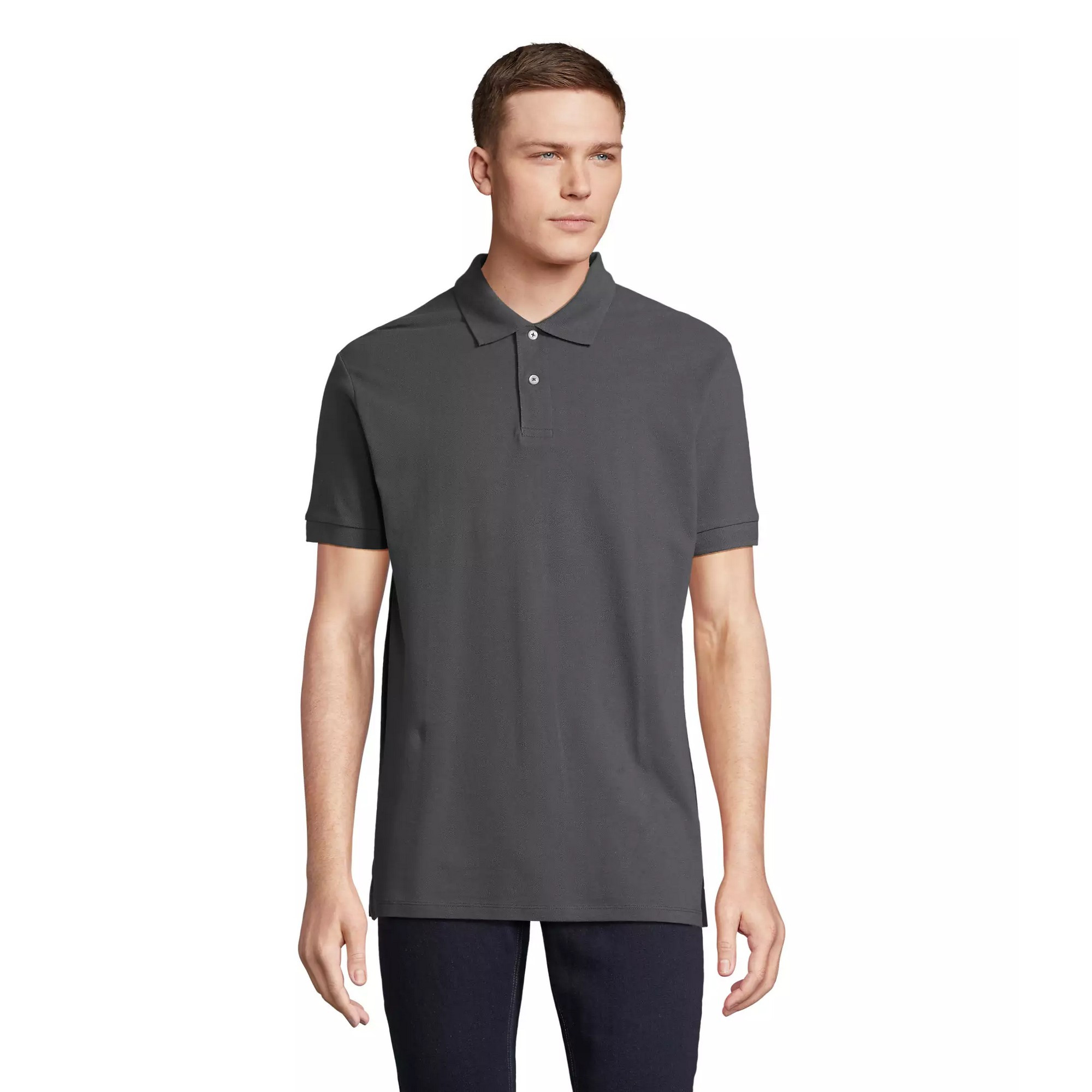 Design/motif: Uni. Coupe: Confortable. Caractéristiques: Patte de col 2 boutons, Boutons nacrés, Fentes latérales renforcées, Coutures latérales, Boutons de rechange, Sans étiquette. Encolure: Côtelée, Bande de propreté, Col rabattu. Type de manches: Manches courtes. Matériau: Peigné. Ourlet: Couture surpiquée. Ourlets bras: Côtelés. Durabilité: ACCORD, Amfori, Better Cotton Initiative (BCI), BSCI, Approuvé par Fair Wear, Certifié Oeko-Tex® Standard 100, Végan approuvé par PETA, REACH, Sustainable Apparel Coalition (Cascale). g/m²: 210. Composition: 100% Coton peigné et filé à l'anneau. S: 96,5 cm. M: 101,5 cm. L: 106,5 cm. XL: 112 cm. 2XL: 119 cm. 3XL: 124,5 cm. 4XL: 132 cm. 5XL: 139,7 cm.