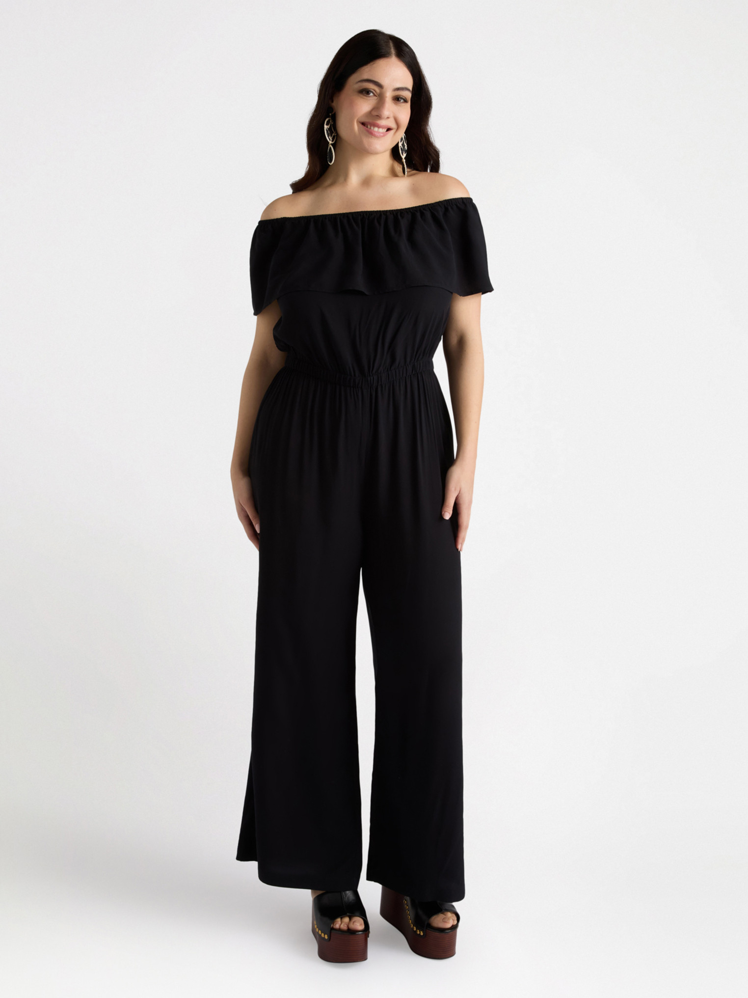 Combinaison en viscose LENZING™ ECOVERO™ avec volant, à porter selon l’envie sur les épaules ; #livefree together car : les fibres LENZING™ ECOVERO™ proviennent de sources en bois contrôlées ou certifiées et soutiennent la douceur et le drapé naturels ; élastique intérieur à la taille et pantalon large.