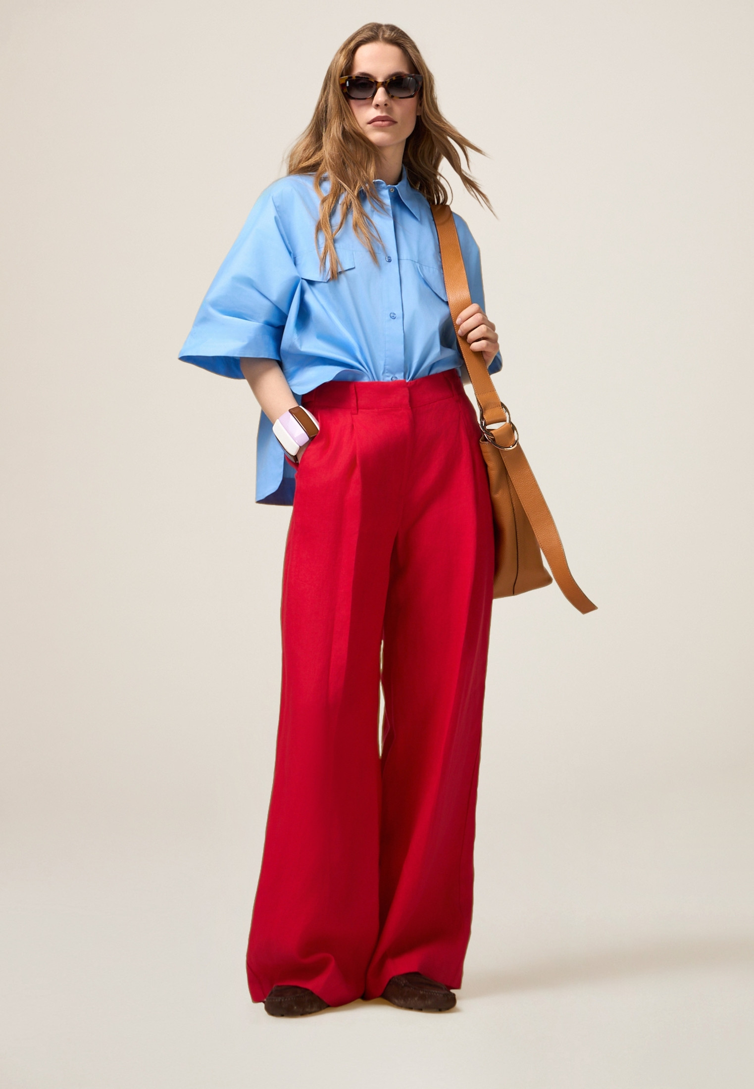 Pantalon palazzo réalisé en lin frais ; jambe large, fermeture à crochets et zip ; détail de pinces, pli repassé le long des jambes, poches américaines devant et poches arrière factices à passepoil.