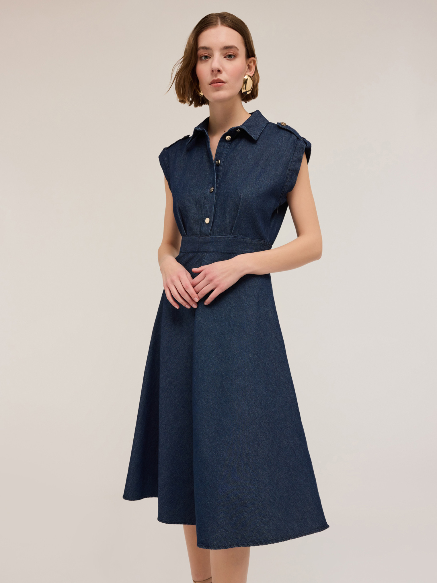 Robe chemisier en chambray mélangé lyocell ; col italien et boutons sur le devant en métal, ouverture latérale avec fermeture éclair ; modèle avec manches papillon taille kimono, jupe cloche mi-longue