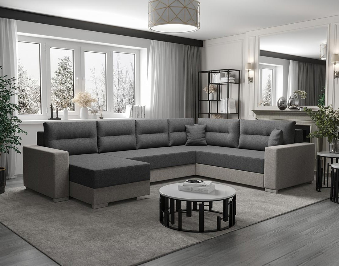 Leslie - Canapé panoramique d'angle réversible 7 places convertible avec coffre en tissu