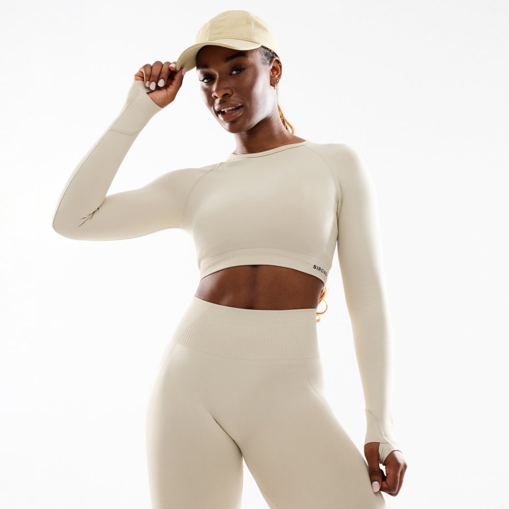 T-shirt crop top sport manches longues sans couture femme Fitness Victory Beige