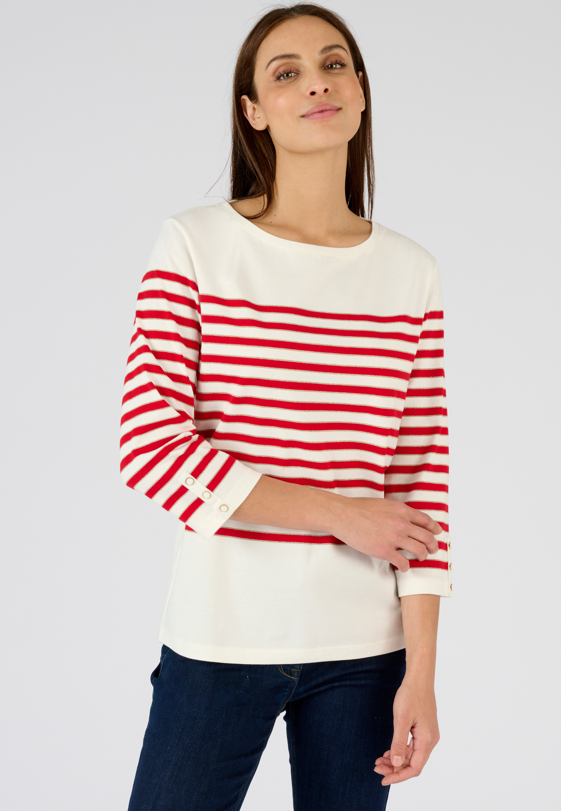 Information sur l'offre : Craquez pour l'incontournable marinière en coton majoritaire, un classique revisité qu'on aime toujours autant ! Avec ses rayures parfaitement raccordées agrémentées de fil brillant doré, cette pièce iconique assure un style soigné et intemporel. Les manches 3/4, terminées par de boutons fantaisie, ajoutent une touche de style à ce modèle, idéal pour vos looks décontractés de la saison. Longueur du t-shirt rayé femme 61 cm environ. ŒKO-TEX® STANDARD 100 CQ1194/1- IFTH.