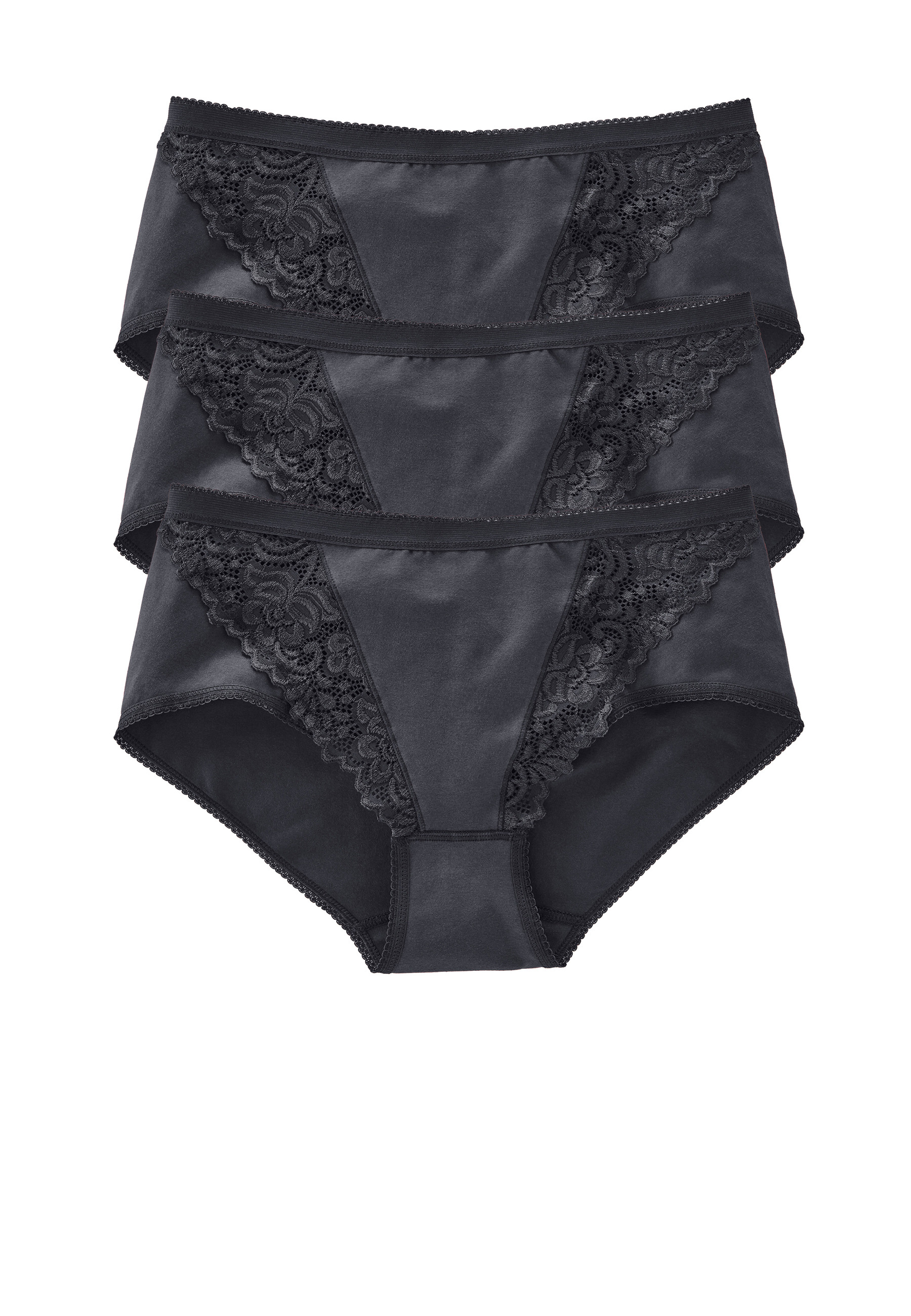 Information sur l'offre : Ces culottes vous offrent le confort de la maille jersey extensible et du coton, sublimée de dentelle extensible en ton sur ton. Ceinture élastiquée confort, finition picots, intérieur doux. Forme couvrante. Finitions picots élastiqués. Lot composé de 3 culottes blanches ou coloris assortis. Existe également en culotte maxi sur ce site. ŒKO-TEX® STANDARD 100 CQ1194/1- IFTH.