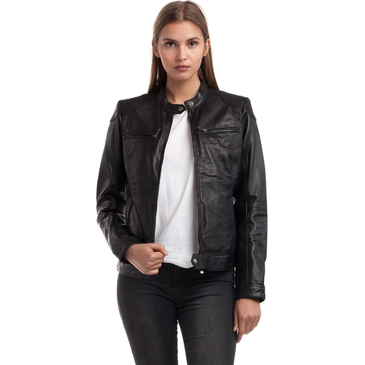 Veste en cuir 100% mouton. Katia est un modèles simple et sobre que vous pourrez porter avec n’importe quelle tenue. Col à revers, coupe courte et ajustée près du corps, c’est un modèle indispensable de la garde robe feminine. Fermeture éclair au centre, poches extérieures et poignées zippées, cette veste représente le style biker par excellence.