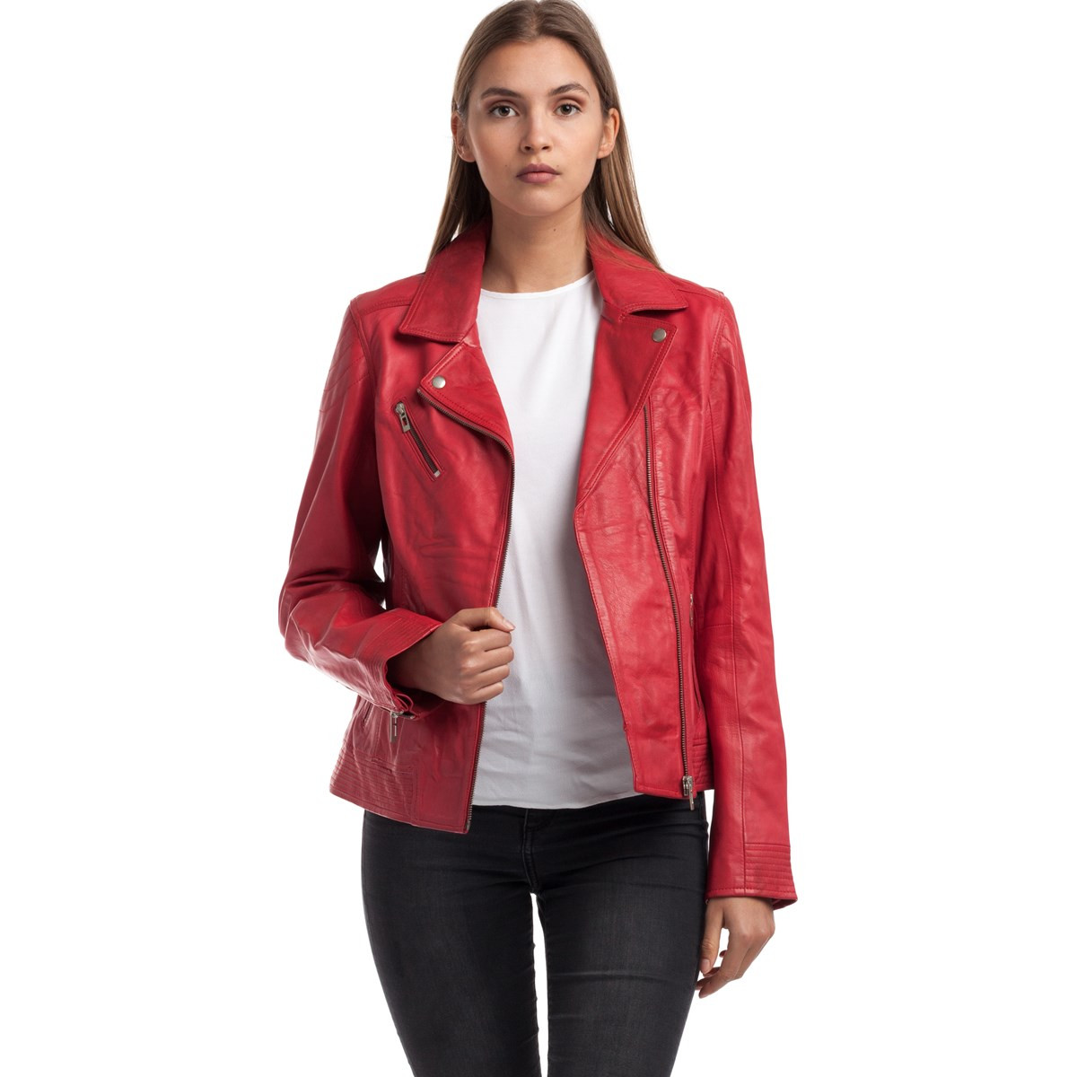 Veste perfecto en cuir 100% mouton. Veste à effet croisé qui lui donnant un aspect très élégant. Alexine est une pièce essentielle de la garde-robe féminine. Coupe courte et ajustée près du corps, notre perfecto se porte aussi bien ouvert que fermé. La veste a plusieurs fermetures éclair, deux sur les poches extérieures et une sur la poitrine.