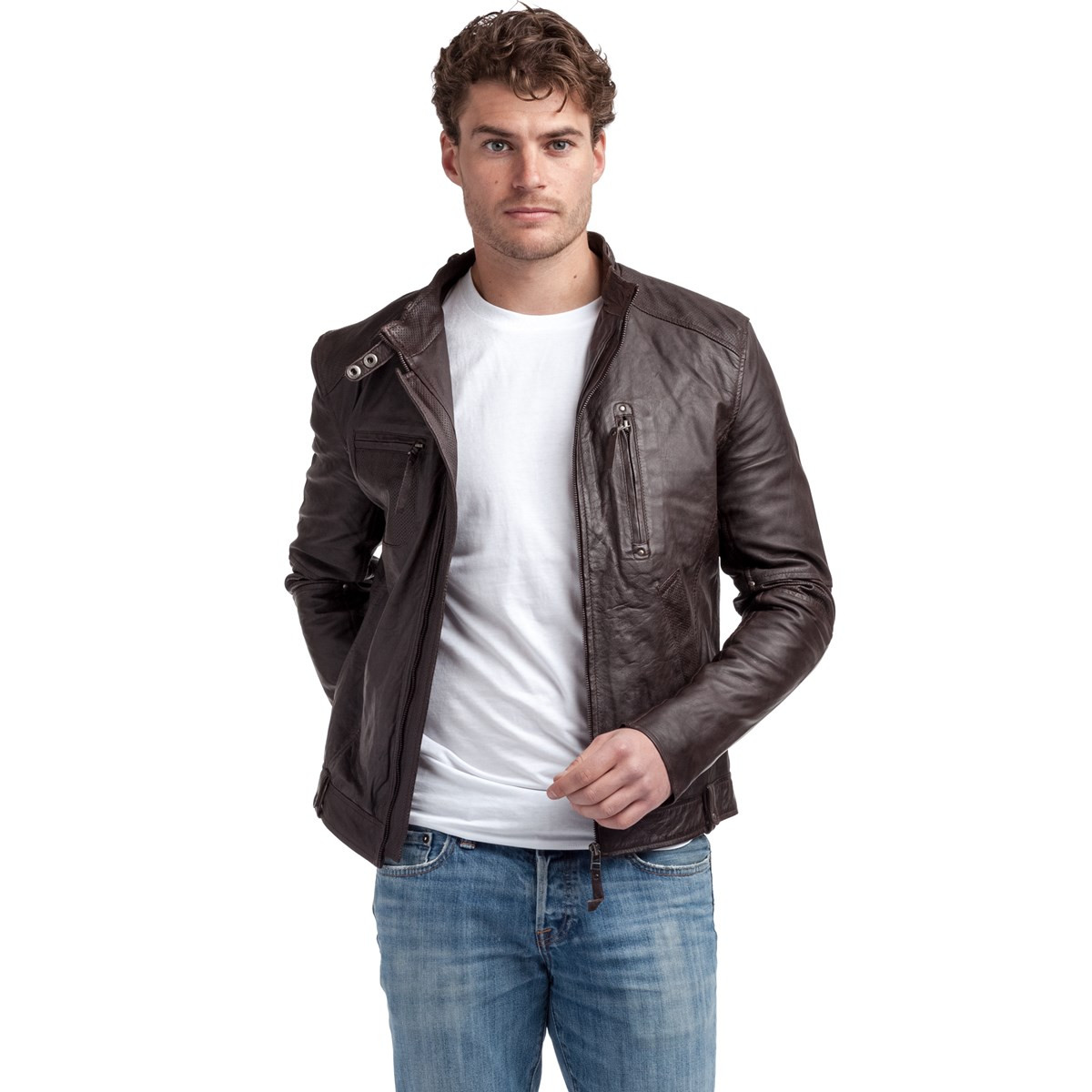 Veste en cuir 100% mouton. Une coupe courte et ajustée, la veste Jacky est une pièce indispensable dans le vestiaire masculin. Son petit col rigide effet chemise lui donne un style élégant et urbain. Poches passepoilées, sans fermeture éclair lui donnent un aspect plus informel. Vous pourrez la porter aussi bien avec un jean qu’avec une pantalon de costume pour un style 90’s.
