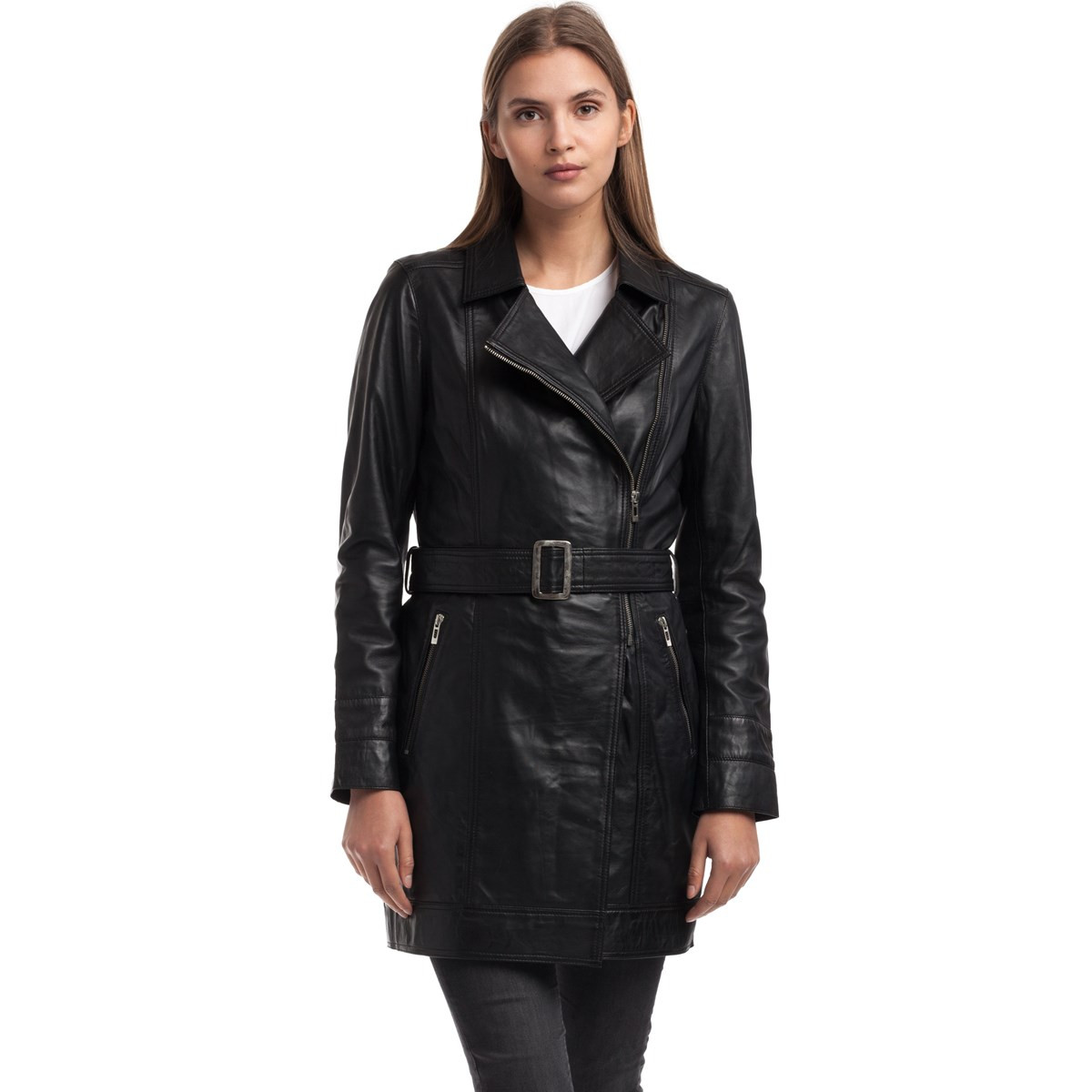 Trench en cuir 100% mouton. Coupe longue et ajustée près du corps, col à revers et ceinture amovible intégrée, c’est une pièce 4 saisons que vous pourrez porter toute l'année. Poignets patte boutonnée et poches basses, cette veste se porte aussi bien ouverte que fermée. Eleonore vous donnera un look chic et élégant et habillera parfaitement vos tenues.