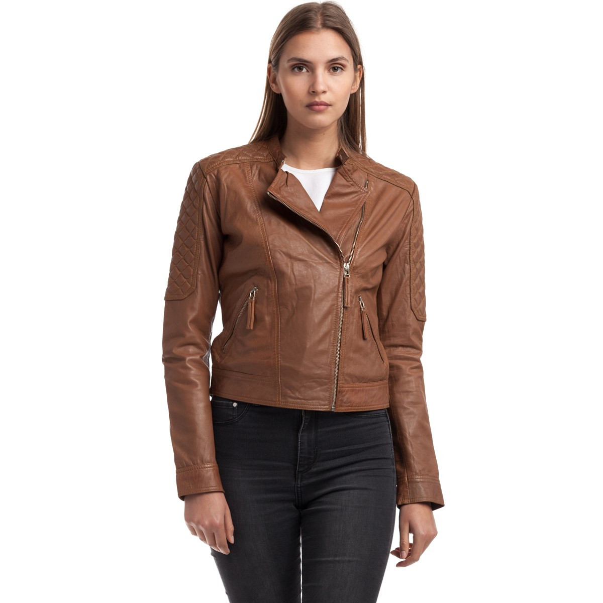 Veste en cuir 100% mouton. Veste effet croisé qui lui donne un look à la fois élégant et urbain. Cassandra est une pièce 4 saison, essentielle de la garde robe feminine. Coupe courte, ajustés près du corps, col à revers et poignées zippées: elle peut se porter aussi bien ouverte que fermée. La veste contient deux poches à fermetures éclair.