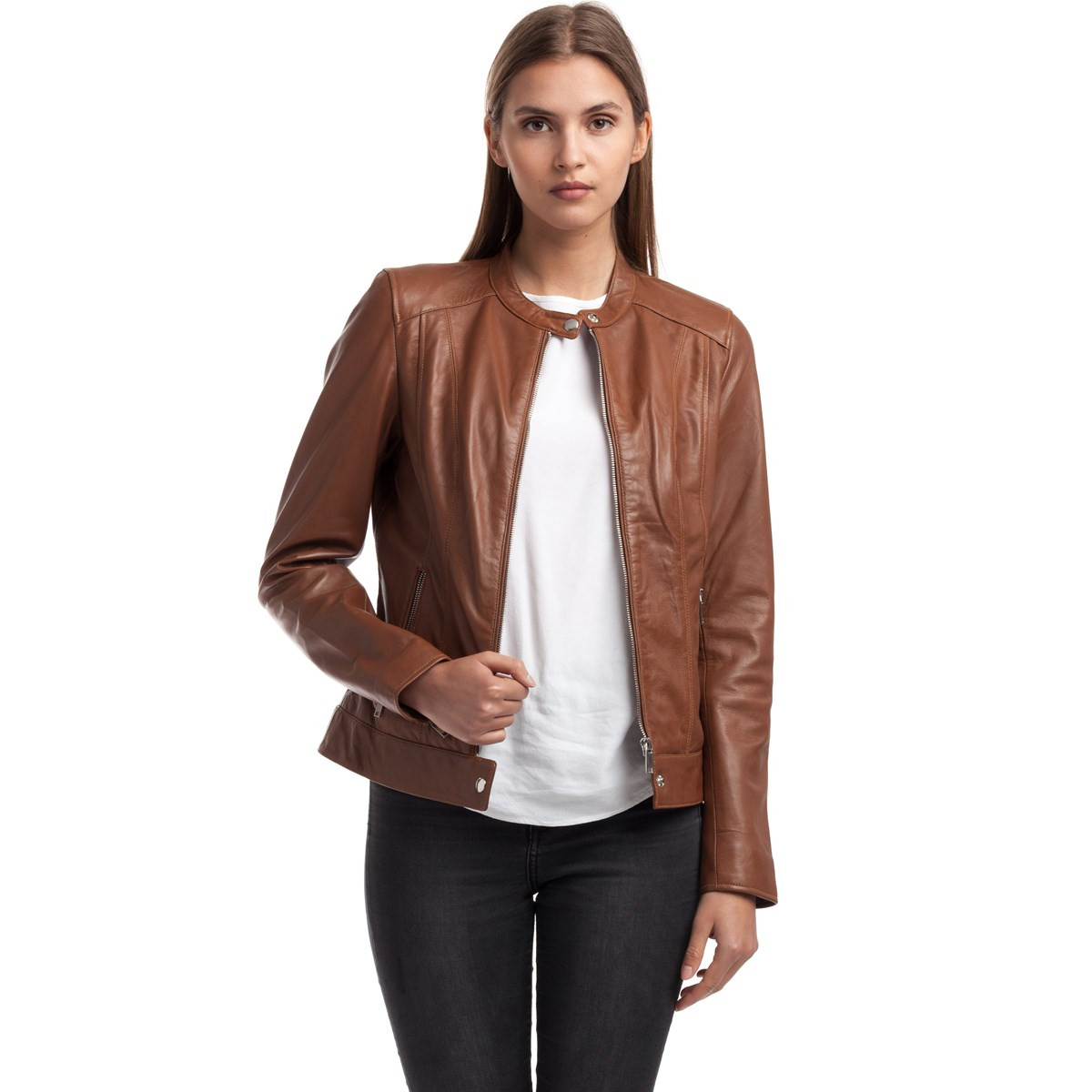 Veste en cuir 100% mouton. Coupe courte et ajustée près du corps, Celeste se porte durant toute l'année. Il s’agit d’un modèle emblématique de notre collection.  Avec sa fermeture éclair au centre, ses boutons pression au col et à la taille, elle s’accordera parfaitement avec un jean ou avec une robe.