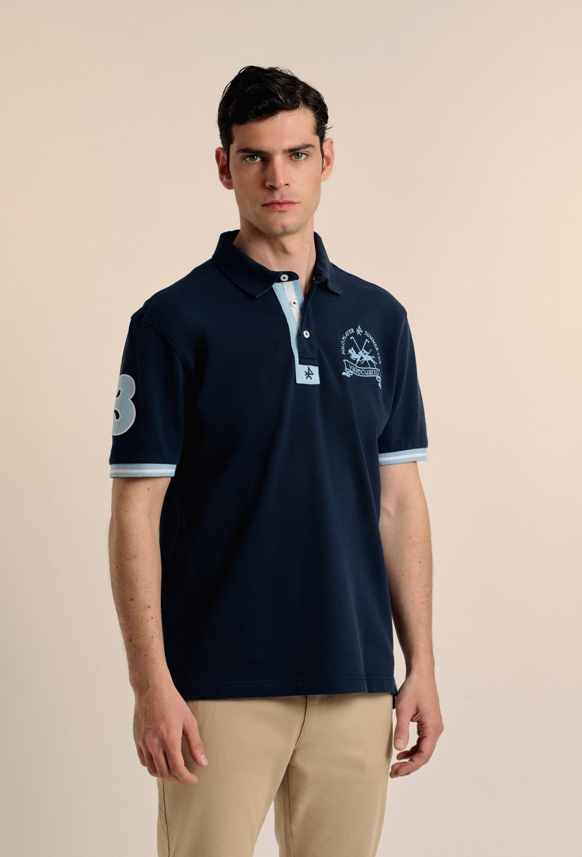 Polo à manches courtes en piqué 100% coton, avec logo sur la poitrine et numéro sur la manche. Finitions côtelées et patte de boutonnage à deux boutons. Bas avec fentes latérales.