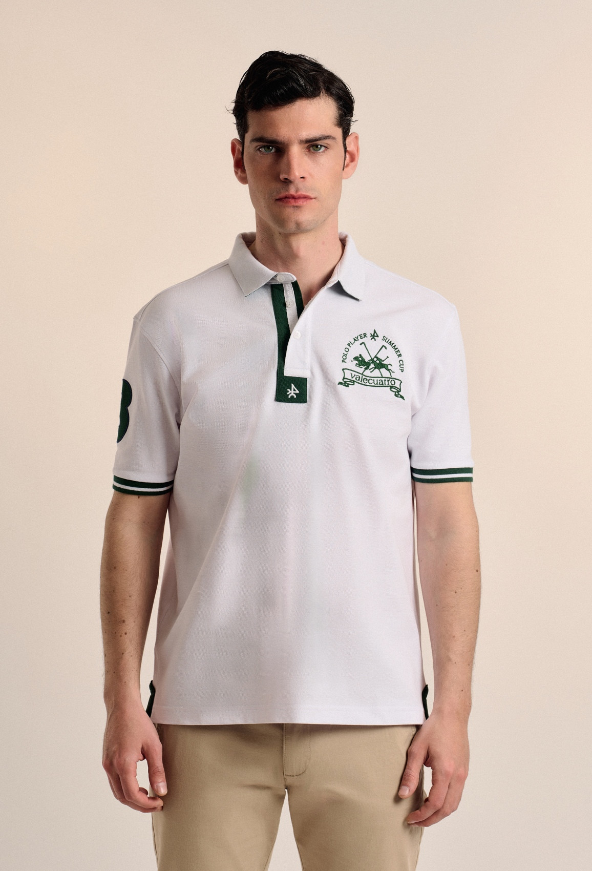Polo à manches courtes en piqué 100% coton, avec logo sur la poitrine et numéro sur la manche. Finitions côtelées et patte de boutonnage à deux boutons. Bas avec fentes latérales.