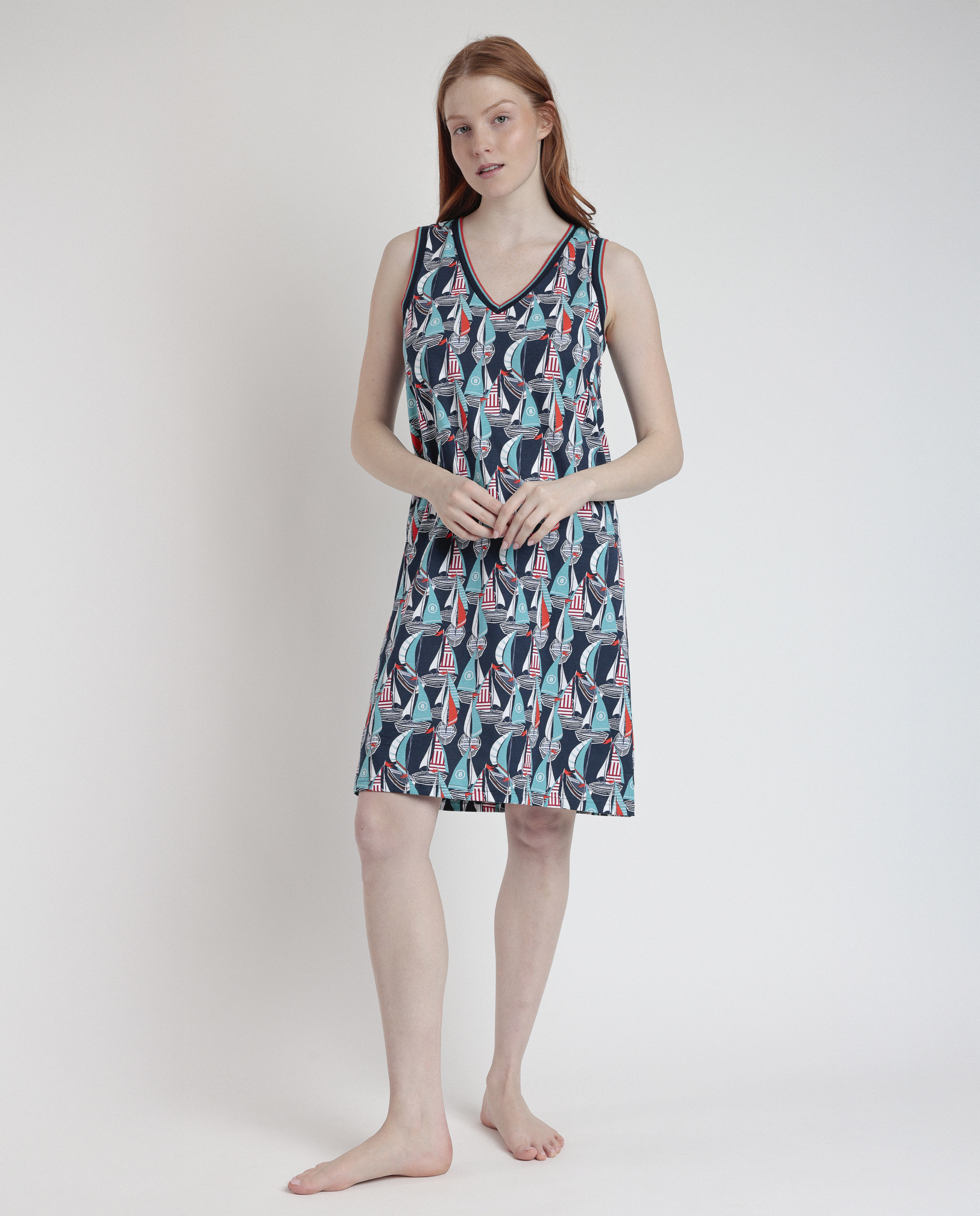 * Caraco en tricot de coton, sans manches, col V, bleu.