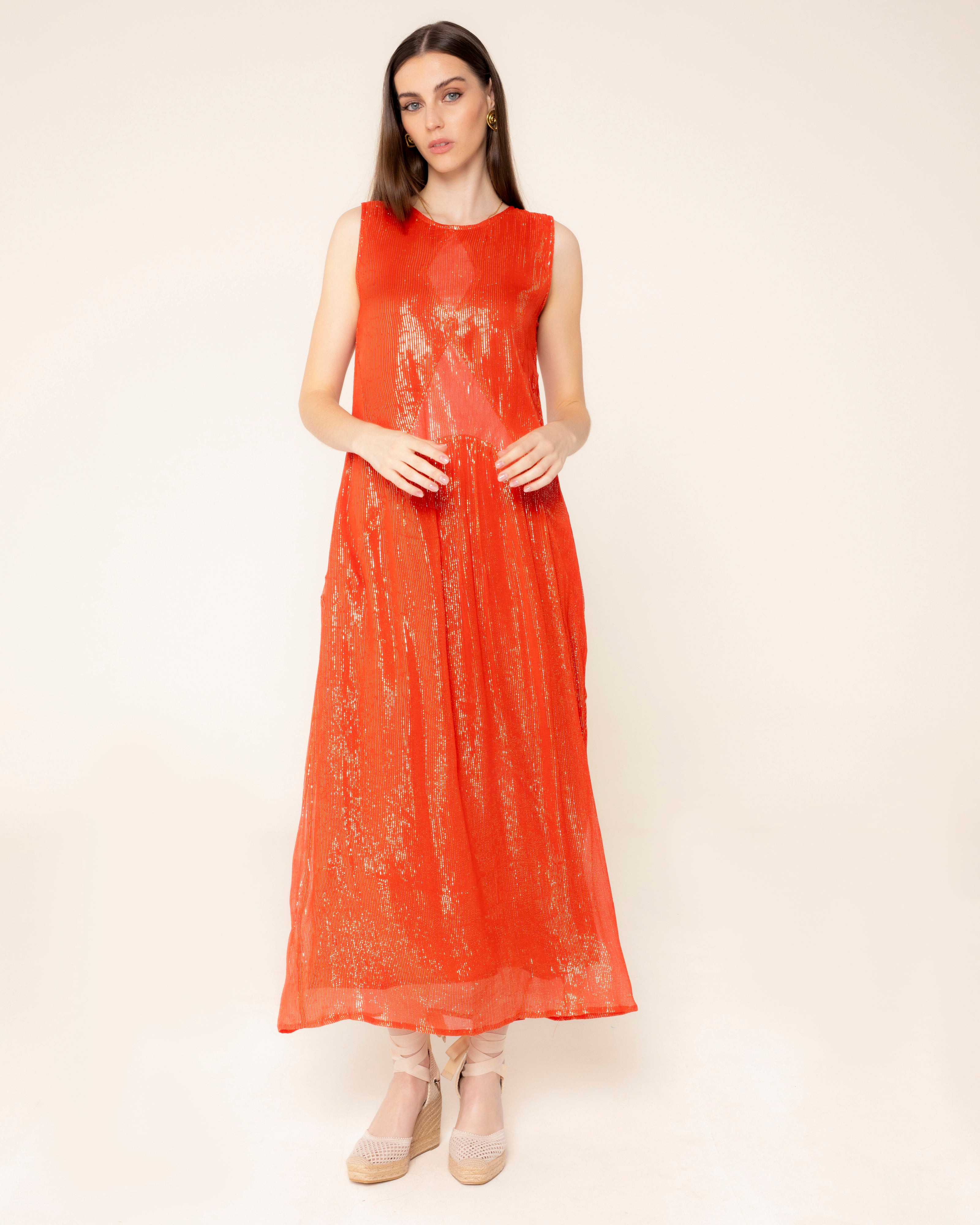 La robe corail lumineuse Nayara est parfaite pour sa couleur estivale. Combinée à des coupes géométriques et à un tissu brillant, cette robe devient le choix idéal pour les événements spéciaux. Robe longue à col rond et manches sans manches. Combinaison de coupes géométriques sur le devant et le dos.