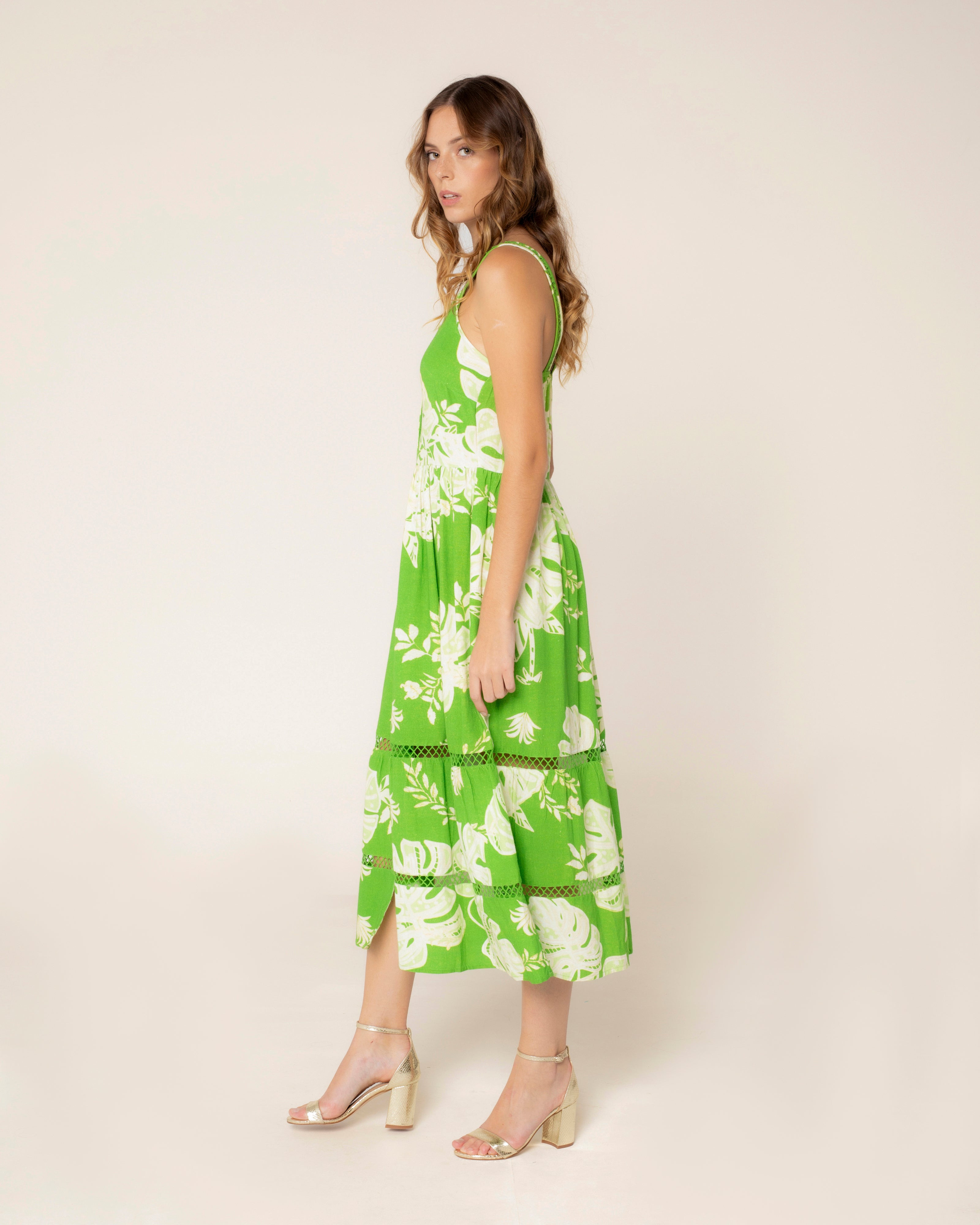 Légère et avec une touche tropicale, cette longue robe tropicale capture l'essence de l'été avec son design frais et léger. Son col rond et ses fines bretelles offrent une esthétique délicate et féminine, parfaite pour les journées ensoleillées. La fermeture boutonnée sur le devant ajoute une touche classique et polyvalente, tandis que le détail du ruban à l'ourlet introduit un élément artisanal qui met en valeur la fluidité du tissu. Son imprimé tropical vibrant évoque la beauté de la nature, faisant de cette robe un choix idéal pour toute occasion spéciale ou escapade estivale. Robe longue à col rond et bretelles. Fermeture boutonnée sur le devant. Détail du ruban en bas.