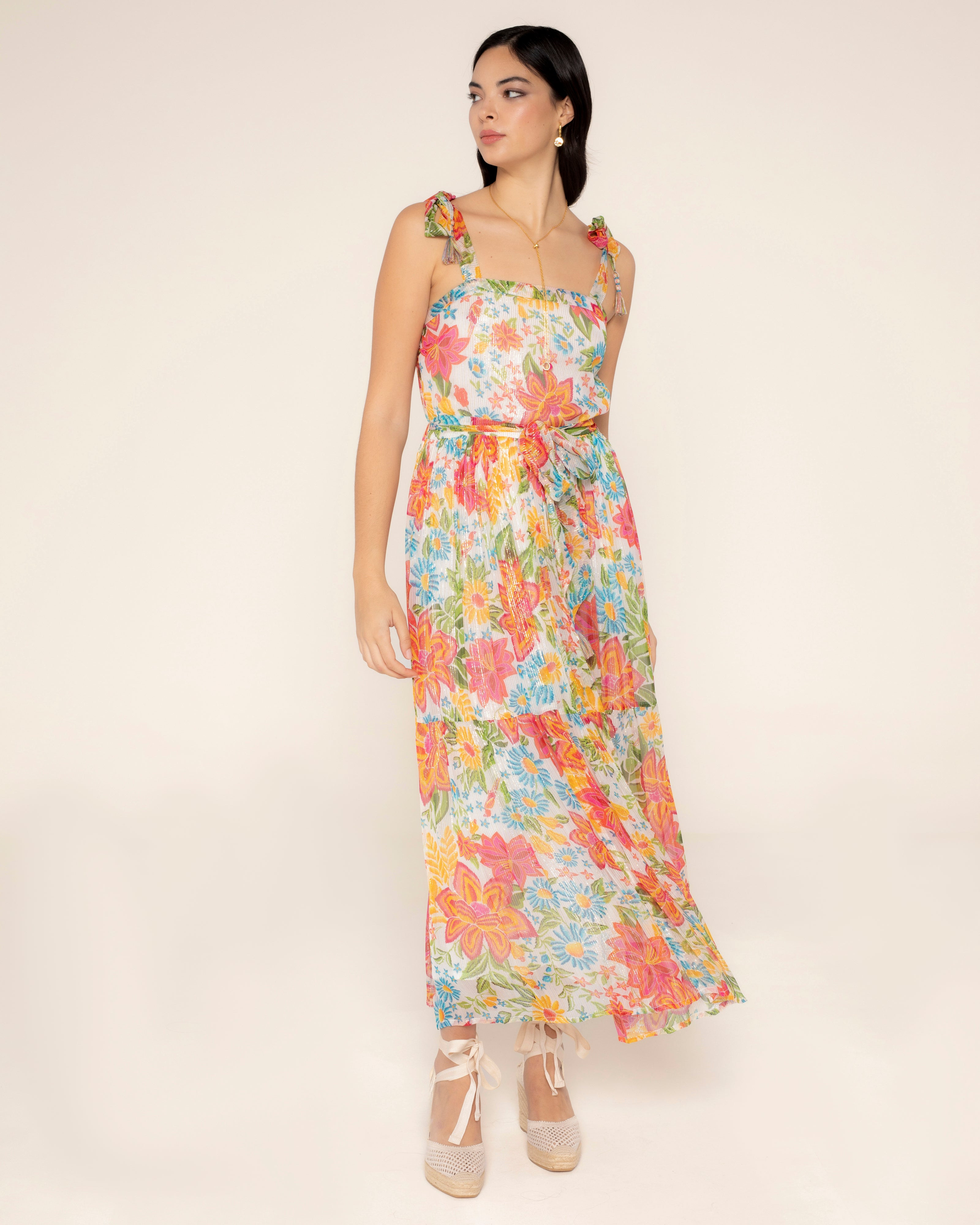 La robe longue Formentera reflète l'essence de l'été. Son imprimé floral aux tons rose corail et jaune, associé à la brillance subtile du lurex, évoque les jours les plus lumineux de la saison. Un design léger et féminin qui s'adapte à chaque instant. Robe longue à col droit avec bretelles réglables. Ceinture noeud du même tissu. Fermeture latérale avec fermeture éclair dissimulée dans la couture.