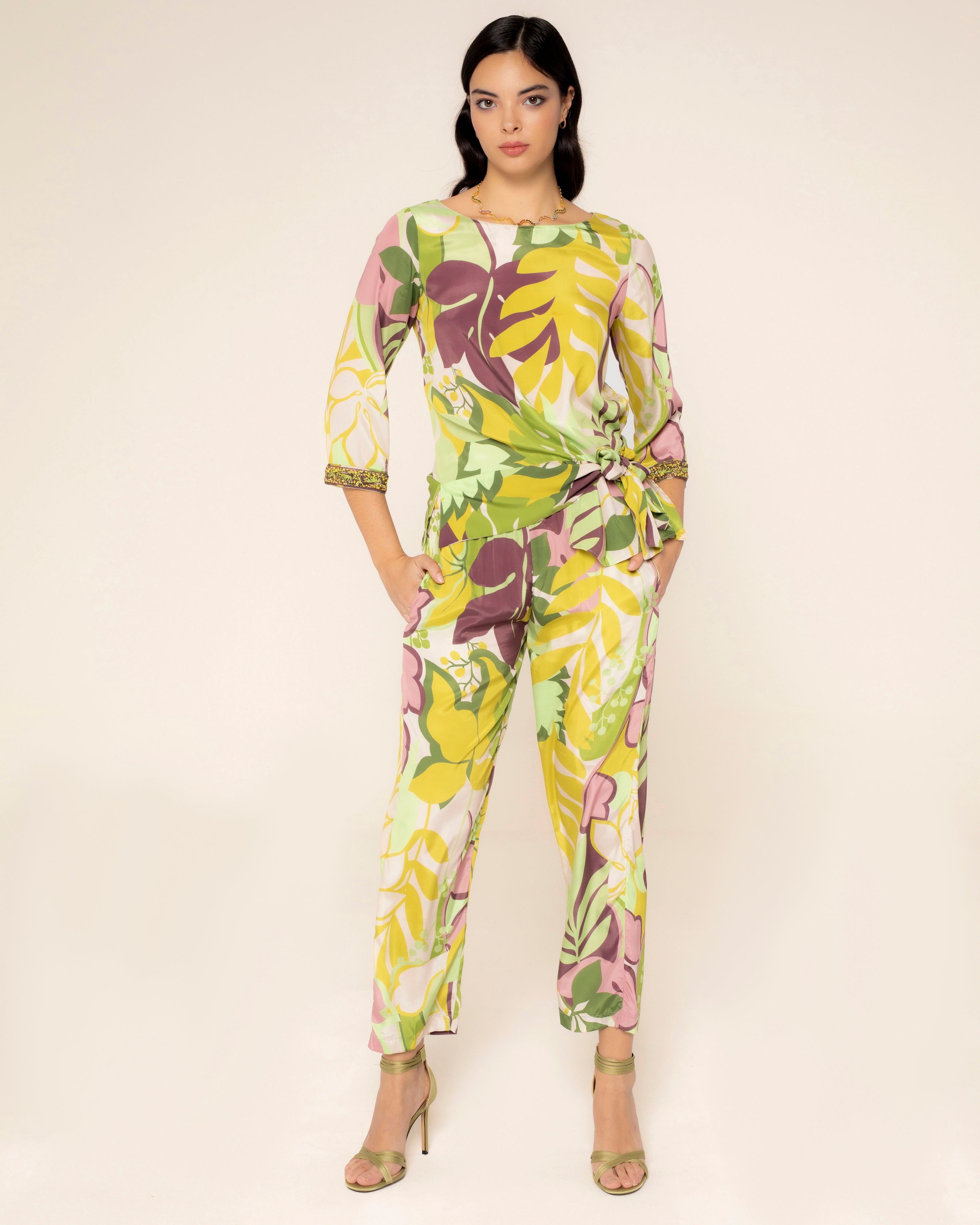 La blouse Malia est une invitation à la vitalité de l'été. Avec son imprimé tropical et ses accents terreux et roses, ce vêtement ajoute une touche exotique et fraîche à n'importe quel look. Chemisier col rond avec manches en dessous du coude. Finition basse avec nœud réglable. Détail de broderie avec application de perles sur le poignet.