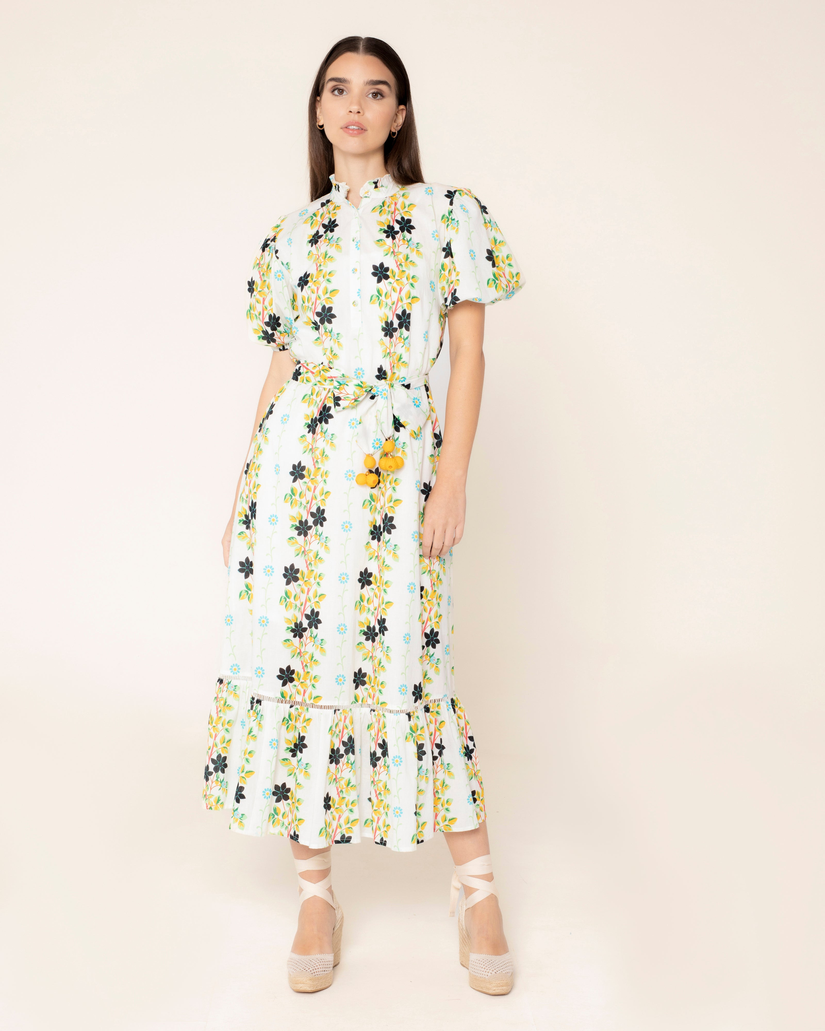 La robe longue boutonnée Roma présente un imprimé vibrant de marguerites et de fleurs grimpantes dans des tons de bleu et de jaune. Sa ceinture ajustable met en valeur votre silhouette, tandis que son design léger et féminin vous invite à profiter des journées ensoleillées avec style. Robe longue avec un col devant et un décolleté en V. Manches courtes bouffantes finies en élastique. Fermeture devant avec boutons et ceinture noeud. Finition basse au niveau du volant.