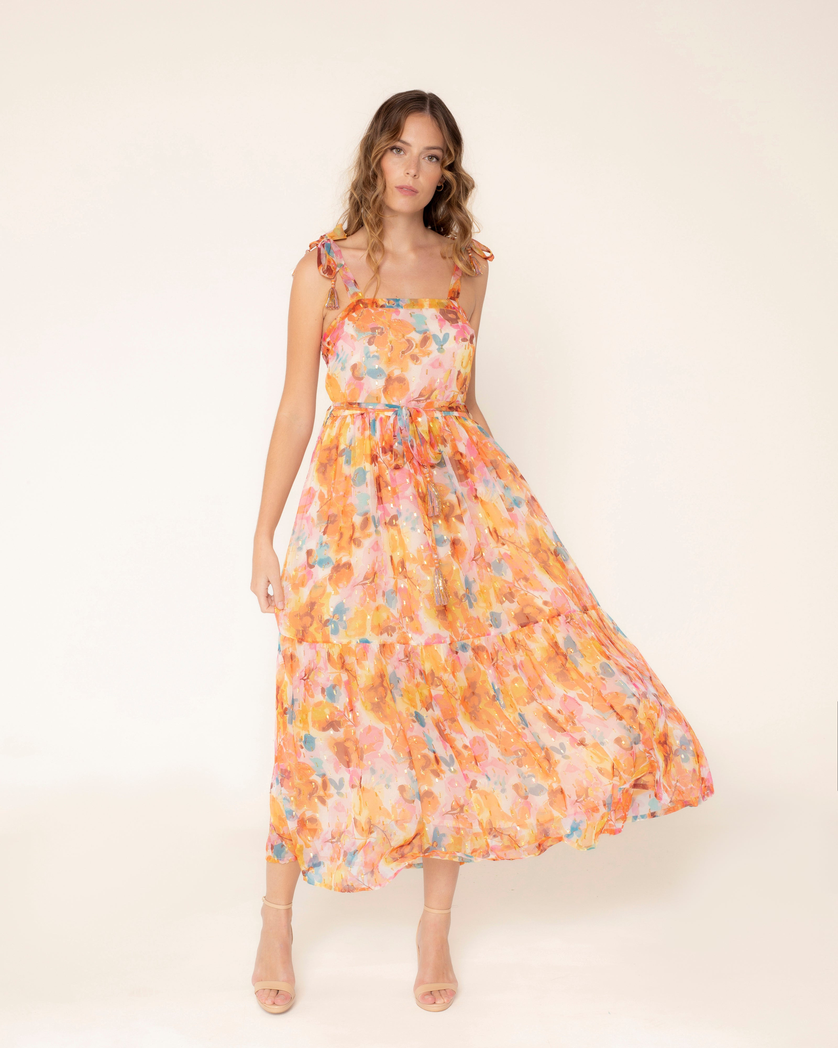 La Robe Longue Santorini enveloppe la silhouette dans une délicate danse de fleurs et de fines feuilles aux tons orangés, évoquant la chaleur d'une journée ensoleillée. Doté de bretelles réglables et d'une ceinture à nouer, il offre un ajustement parfait qui met en valeur la silhouette. Son ourlet volanté ajoute du mouvement et une touche romantique, idéale pour des moments joyeux. Robe longue à décolleté droit et bretelles réglables. Ceinture noeud du même tissu. Finition basse avec volant. Fermeture latérale avec fermeture éclair dissimulée dans la couture.