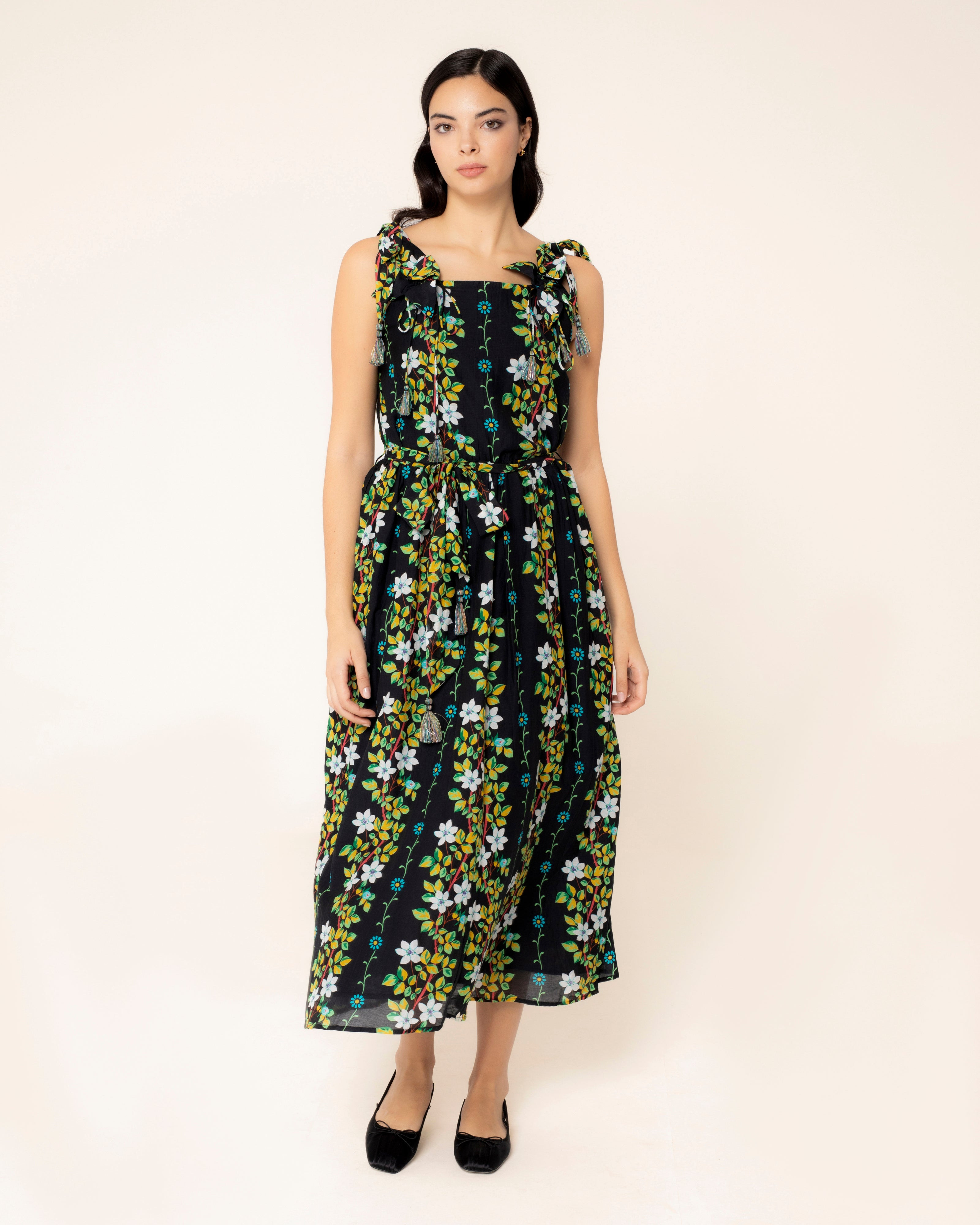 La robe longue Roma en noir capture la sophistication avec son imprimé floral vert et bleu. Ses fines bretelles et son imprimé floral ajoutent une touche romantique, tandis que sa fluidité en fait un incontournable pour des nuits d'été inoubliables. Robe longue à fines bretelles et applications de fleurs. Fermeture latérale avec fermeture éclair dissimulée dans la couture. Ceinture noeud du même tissu.