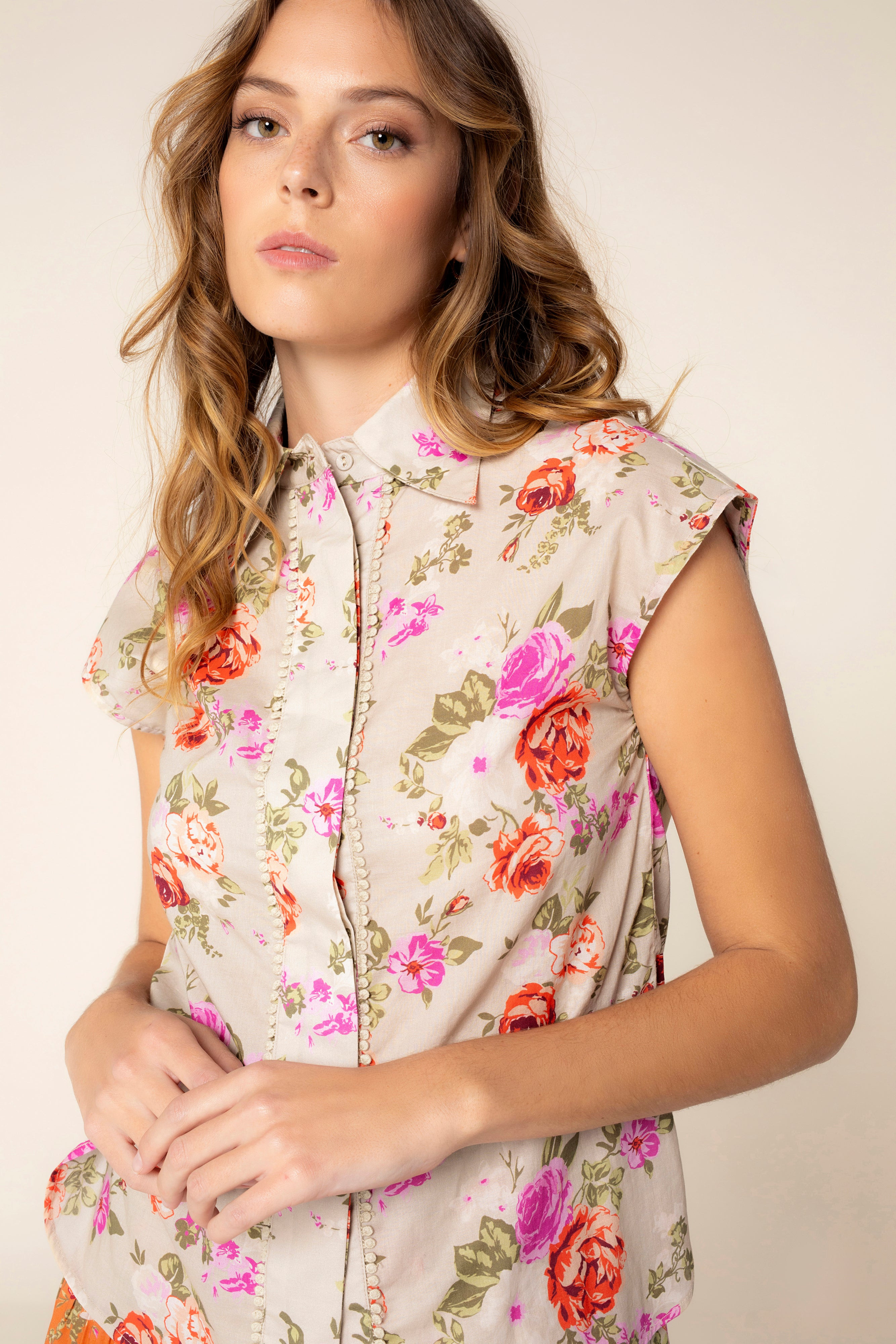 La blouse fleurie Rosys, avec son imprimé coloré, évoque un jardin printanier en mouvement. Vous pouvez l'associer à sa jupe assortie ou créer d'innombrables looks printaniers. Chemise avec col à revers et manches sans manches. Fermeture devant avec boutons cachés par un rabat.