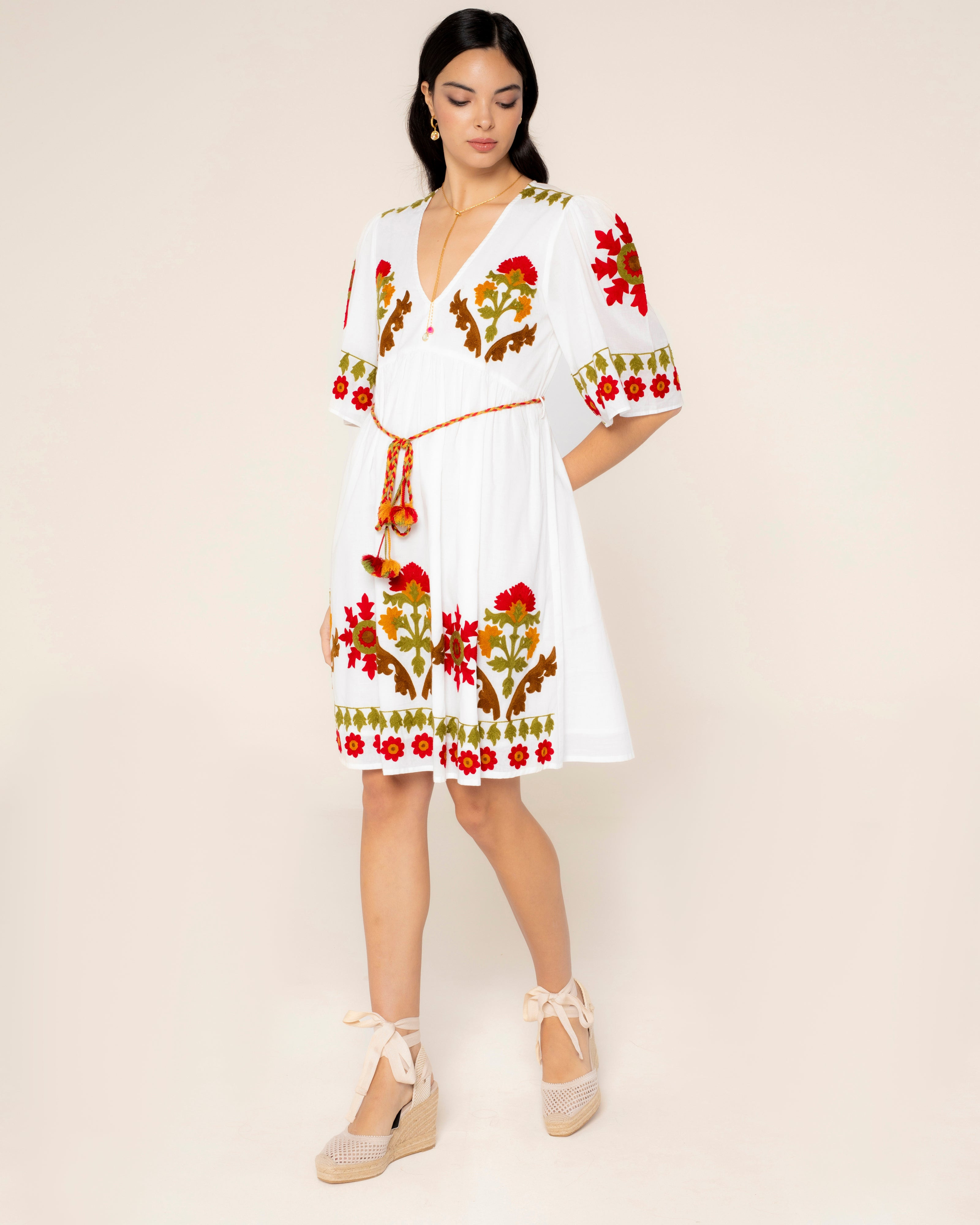 Laissez-vous séduire par l'essence libre et sophistiquée de cette robe courte bohème blanche, une pièce qui rend hommage à l'artisanat et à la féminité. Son décolleté en V sublime délicatement la silhouette, tandis que les manches évasées offrent un mouvement éthéré et romantique. La broderie florale vibrante se détache sur le fond blanc, reflétant la richesse de l'artisanat et l'esprit bohème de NICE. La ceinture en cordon contrasté définit la silhouette avec une touche subtile, lui permettant de s'adapter à votre style. Fraîche, légère et pleine de détails uniques, cette robe est le choix parfait pour celles qui recherchent un vêtement polyvalent avec une âme bohème. Robe courte avec décolleté en V. Manches sous le coude en ligne évasée. Ceinture en cordon de couleur contrastée. Détail de broderie florale sur le devant et la manche.