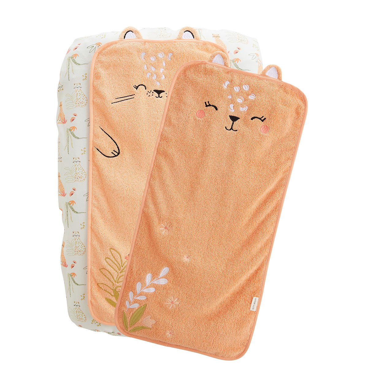 Une housse de matelas à langer avec ses deux tapis de change : pratique pour laver facilement et sans soucis. On adore ces jolis tapis de change pêche et abricot en éponge et ses jolis détails trop mignons. On craque, pas vous ?Facilement adaptable à la plupart des matelas à langer en mousse non rigides grâce à son élastiqueOn craque pour les broderies et les petites oreilles paddées sur les tapis de change !Tapis de change en éponge amovibles par scratch et lavables en machineDimensions de la housse : 68 x 42 cmDimensions des tapis de change : 62,5 x 30 cmMatelas à langer non fourniPhotos non contractuelles : les visuels sont fournis à titre illustratif. Les accessoires visibles ne sont pas inclus, l'offre concerne uniquement les pièces mentionnées dans le titre.