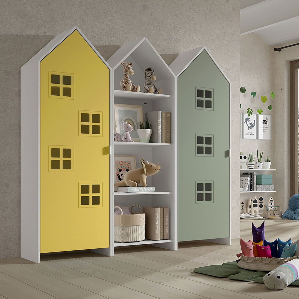 Pack Bibliothèque + 2 Armoires Cabane Portes Verte et Jaune de la gamme Beauville.