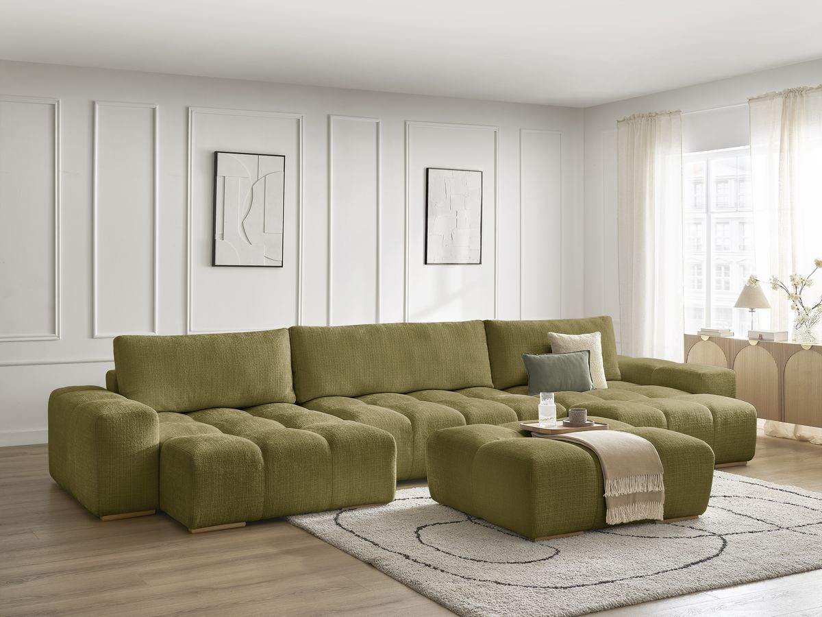 Canapé panoramique fixe ANAKIN tissu texturé avec pouf 3 coussins Vert BOBOCHIC