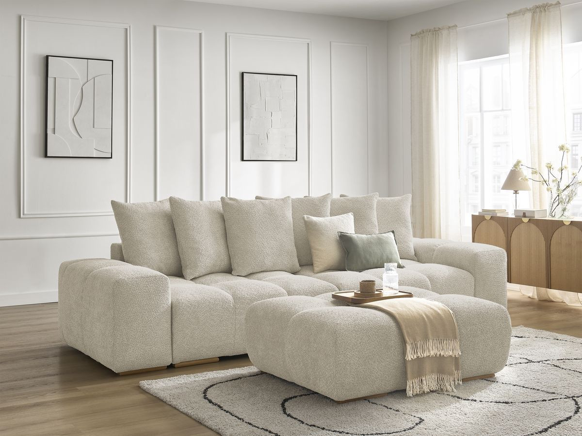 Pour cette nouvelle collection ANAKIN, nous avons fait le choix de la décliner en deux revêtements différents afin que vous puissiez personnaliser son visuel et son confort. Envie d'un intérieur doux et apaisant ? Créez-vous un espace chaleureux avec les canapés ANAKIN dans leur déclinaison en tissu bouclette. En effet, le tissu bouclette saura mettre en valeur les formes du canapé tout en vous proposant un charme cocooning inimitable. Avec son effet texturé et sa touche de douceur, le tissu bouclette est un revêtement qui fera de votre canapé un vrai cocoon de chaleur et un nid de confort !