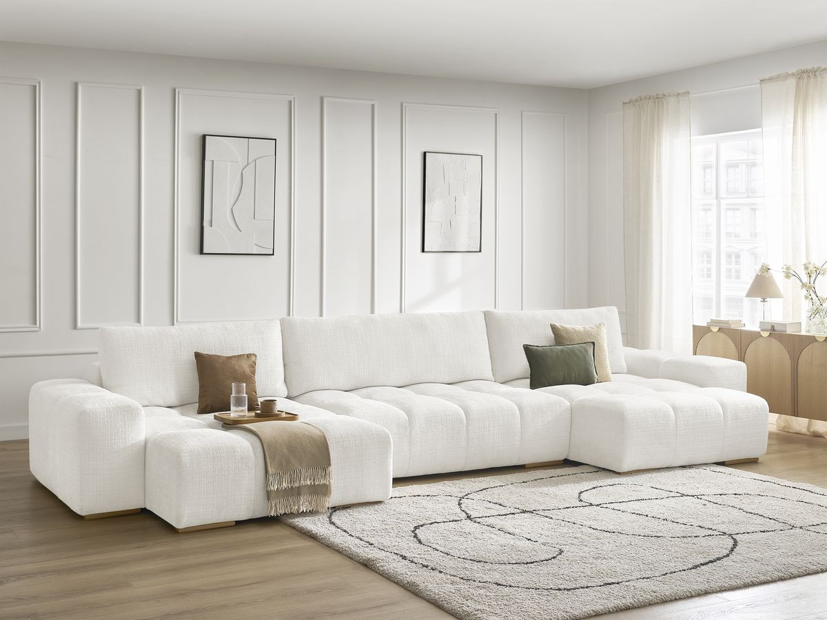 Canapé panoramique convertible coffre ANAKIN tissu texturé 3 coussins Blanc BOBOCHIC