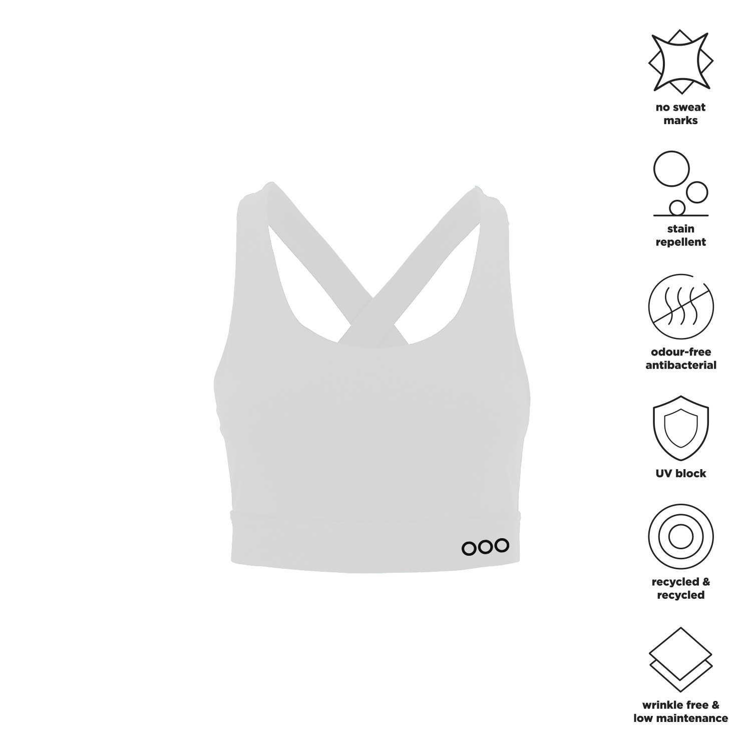 Brassière de sport croisée noire pour femme. Maintien, style et liberté de mouvement, tout en un. La brassière de sport croisée Ecoon offre un maintien optimal et un look sportif grâce à ses bretelles croisées. Fabriquée en tissu technique recyclé, elle offre légèreté et fraîcheur tout au long de la journée, ainsi que des propriétés antibactériennes, à séchage rapide et infroissables. Sa finition antitache et sa protection UV en font le choix idéal pour l'entraînement, les activités de plein air ou au quotidien. Un maintien haute performance et un design original.