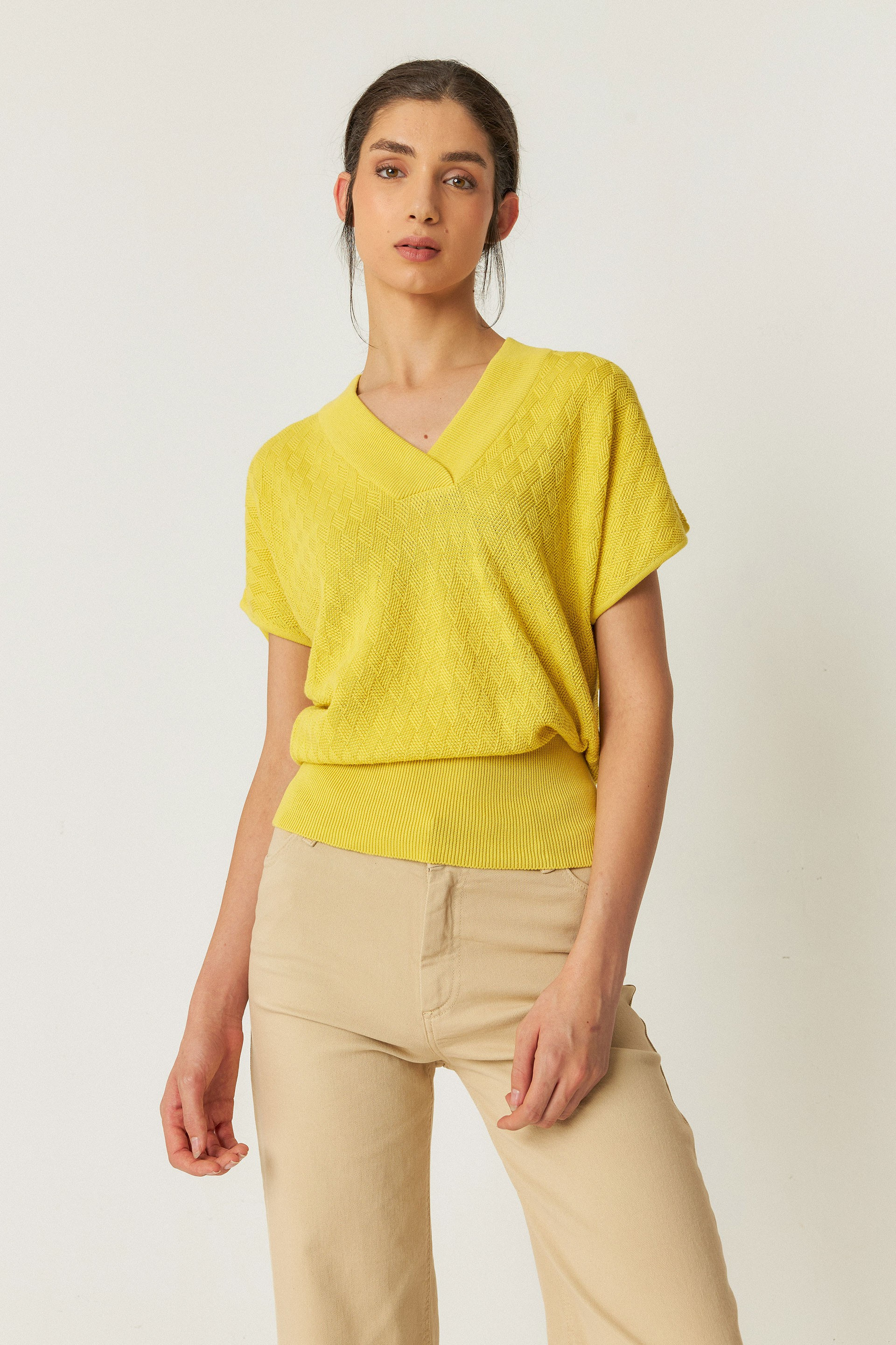 T-shirt à manches courtes et col V en jersey de coton biologique. Bords côtelés au col et à la taille. 100% coton biologique. Lavage à froid, cycle délicat. Repassage à basse température. Ne pas blanchir. Ne pas nettoyer à sec. Ne pas sécher en machine. Laver à l'envers. Laver avec des couleurs similaires. Repasser à l'envers. Ne pas repasser l'imprimé.