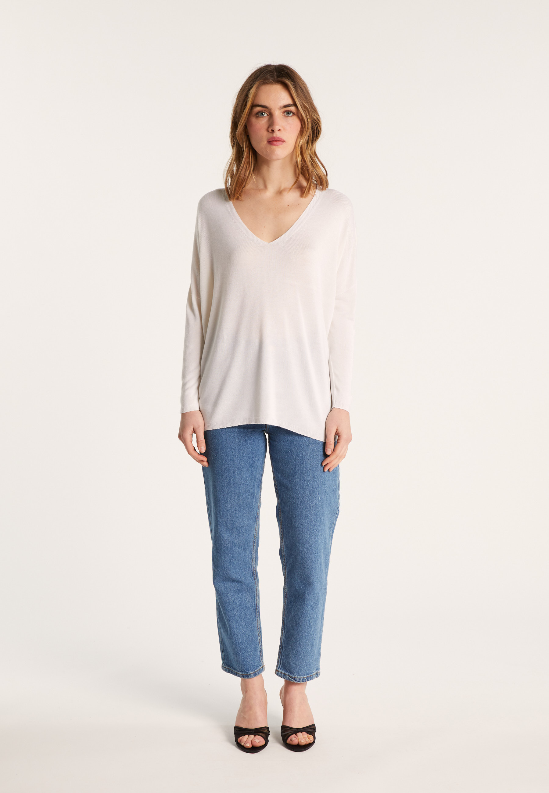 Le t-shirt Nahla se distingue par sa composition en viscose et soie, sa silhouette généreuse et son col V sophistiqué. Ce top à manches longues est fabriqué selon une technique innovante de tricotage 3D, qui élimine les coutures pour un confort supérieur et une fluidité remarquable, épousant délicatement les contours du corps. Cette absence de coutures favorise le bien-être procuré par Nahla qui conjugue aisance et raffinement.