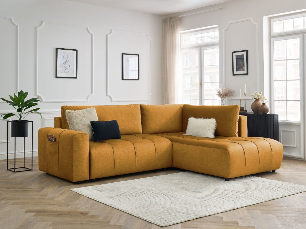 Sublimez votre intérieur et votre confort avec le canapé d'angle L ARSENE. Sa plus grande force ? Sa longue méridienne. Avec les dimensions généreuses de celle-ci, ce canapé saura vous offrir un confort de très haute qualité, aussi bien pour les petites pauses que pour les longues après-midis de détente. De plus, avec sa capacité convertible, vous pourrez le transformer en toute simplicité et rapidité en un couchage occasionnel de grand confort. Sans oublier qu'il dispose d'un coffre, vous permettant d'optimiser votre espace et d'organiser votre rangement !