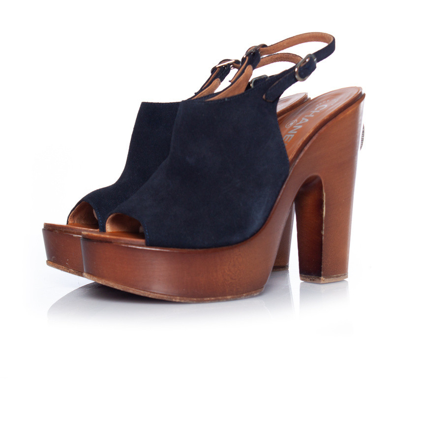 Sabots à bout ouvert Chanel en bois et daim. L'article est en très bon état. Livré avec boîte • ÉTAT : très bon état • TAILLE : 39,5 • MESURES DE LA SEMELLE INTÉRIEURE : 25 cm • MESURES DU TALON : 13 cm PLATEFORME : 3,5 cm • MATIÈRE : bois et daim • COULEUR : bleu marron