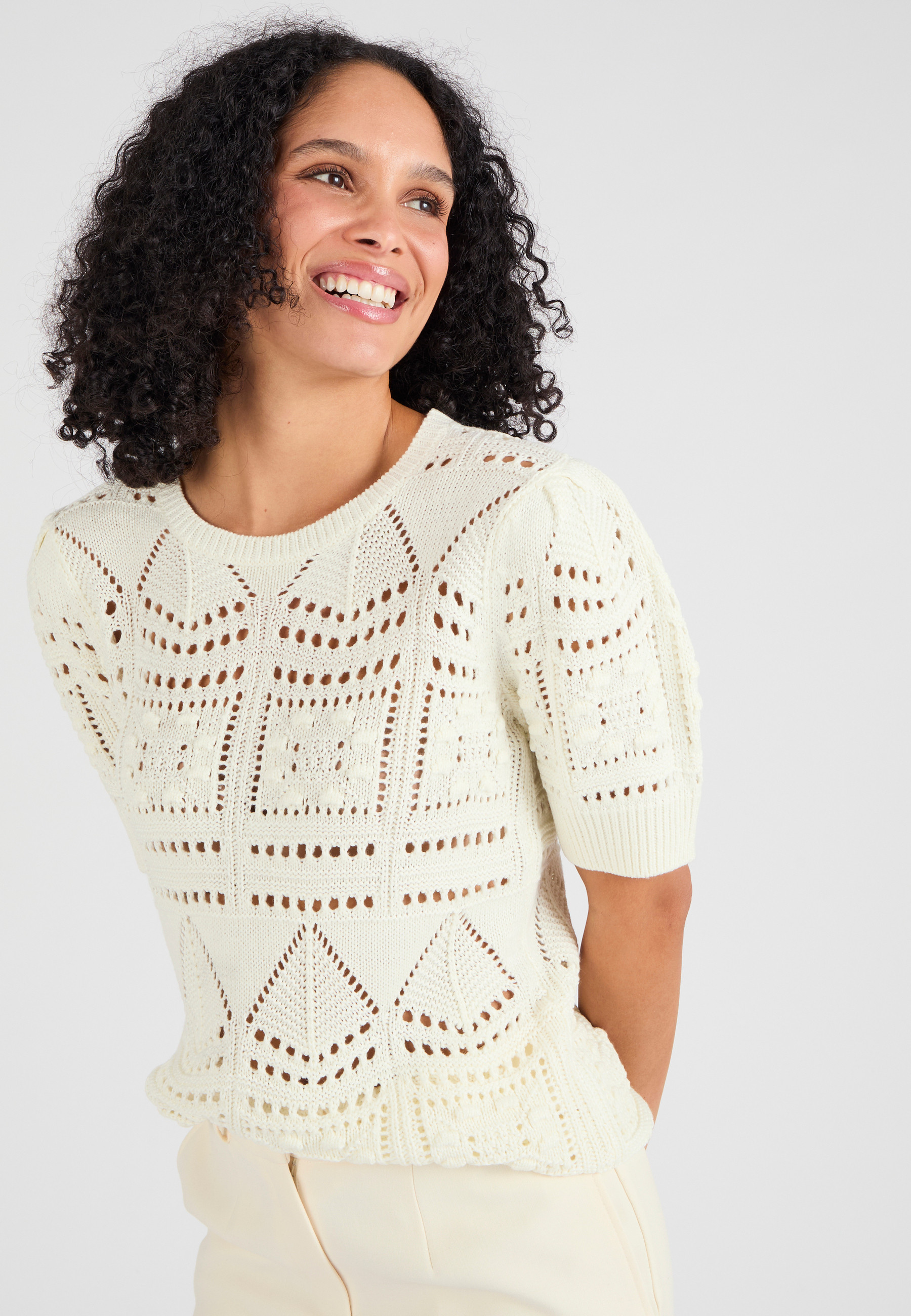 Information sur l'offre : Tout en charme et en féminité, ce pull en maille effet crochet rehausse les looks avec ses couleurs vitaminées. Avec sa maille ajourée et son volume féminin, c'est le pull de toutes les occasions. Parfait avec une jupe comme sur un pantalon : un essentiel chic du vestiaire mi-saison ! Il complète aussi parfaitement un look baskets et jean... Une allure actuelle qui donne du dynamisme au quotidien. Col rond. Il trouve également sa modernité dans ses manches ballon. Des plis placés sur le haut des épaules permettent un effet bouffant actuel. Emmanchures diminuées. Manches courtes. Finitions bord-côtes. Longueur du pull femme 61 cm environ.