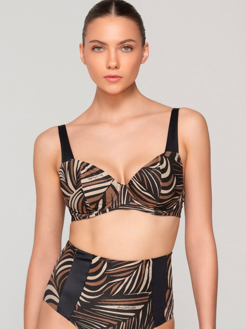 Ce haut de maillot de bain est un modèle balconnet avec des bonnets non préformés, offrant un bon maintien naturel. Forme légèrement emboîtante, avec une découpe en V douce qui suit la ligne de la poitrine. Le tissu est orné d’un motif lurex exotique de feuilles de palmier dans des tons naturels qui apportent une touche sauvage élégante, combiné à un tissu noir satiné pour un look estival ultime. Les fines bretelles sont réglables pour un ajustement parfait. Fermeture dans le dos par un clip.  Fabriqué en microfibre spéciale pour un confort accru, un séchage rapide, une protection solaire et avec la technologie textile la plus avancée.  C’est un choix raffiné et stylé, parfait pour celles qui aiment les imprimés naturels et les coupes classiques revisitées avec élégance.