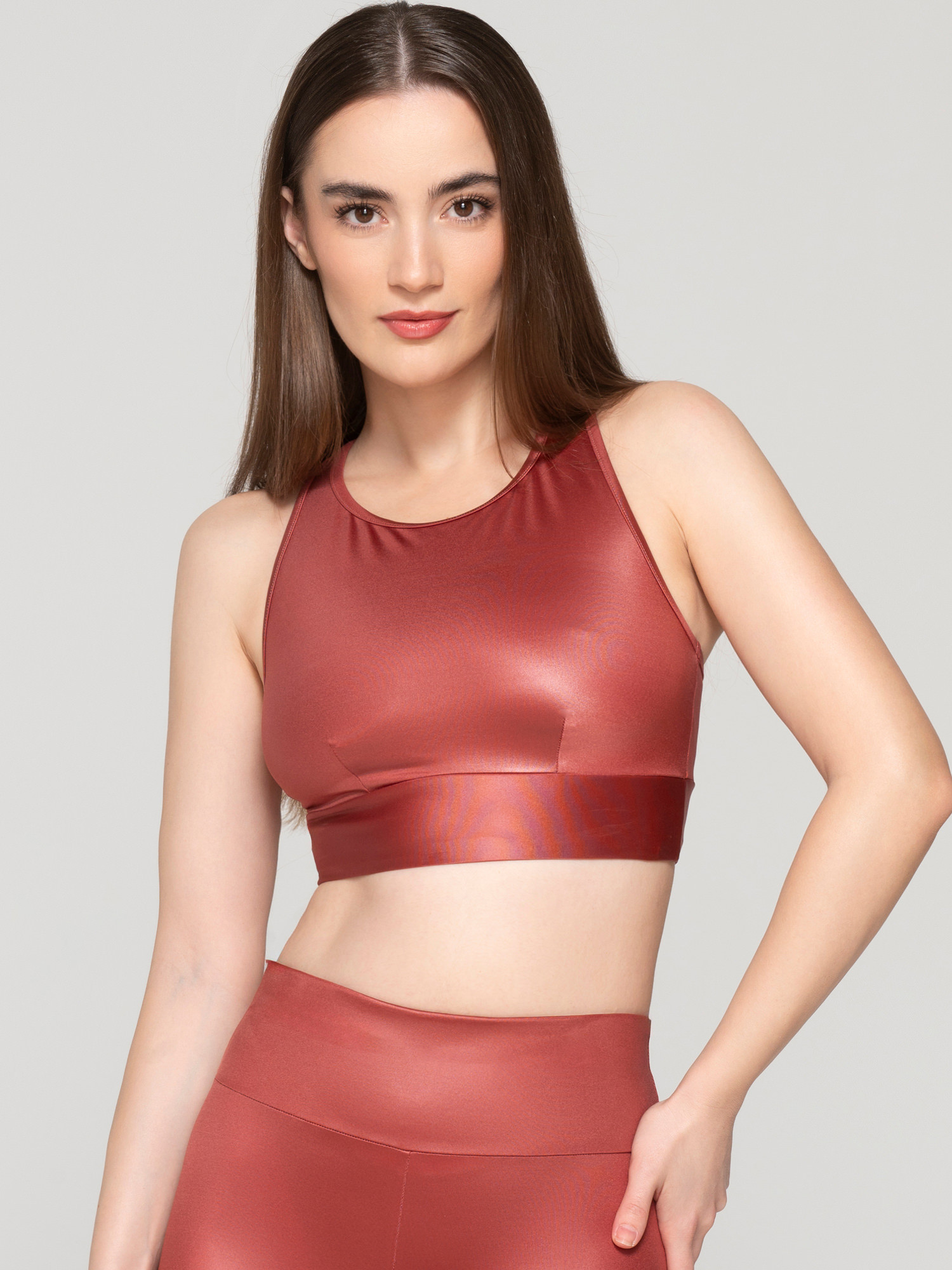 Coupe brassière de sport à encolure dégagée et dos nageur, avec une découpe triangulaire au bas du dos, apportant style et respirabilité. Petit logo doré apposé au centre du dos. Bande de maintien large sous la poitrine. Ce top sportif et chic se distingue par sa coupe dynamique et sa finition brillante, parfait pour des entraînements intensifs ou un look affirmé.