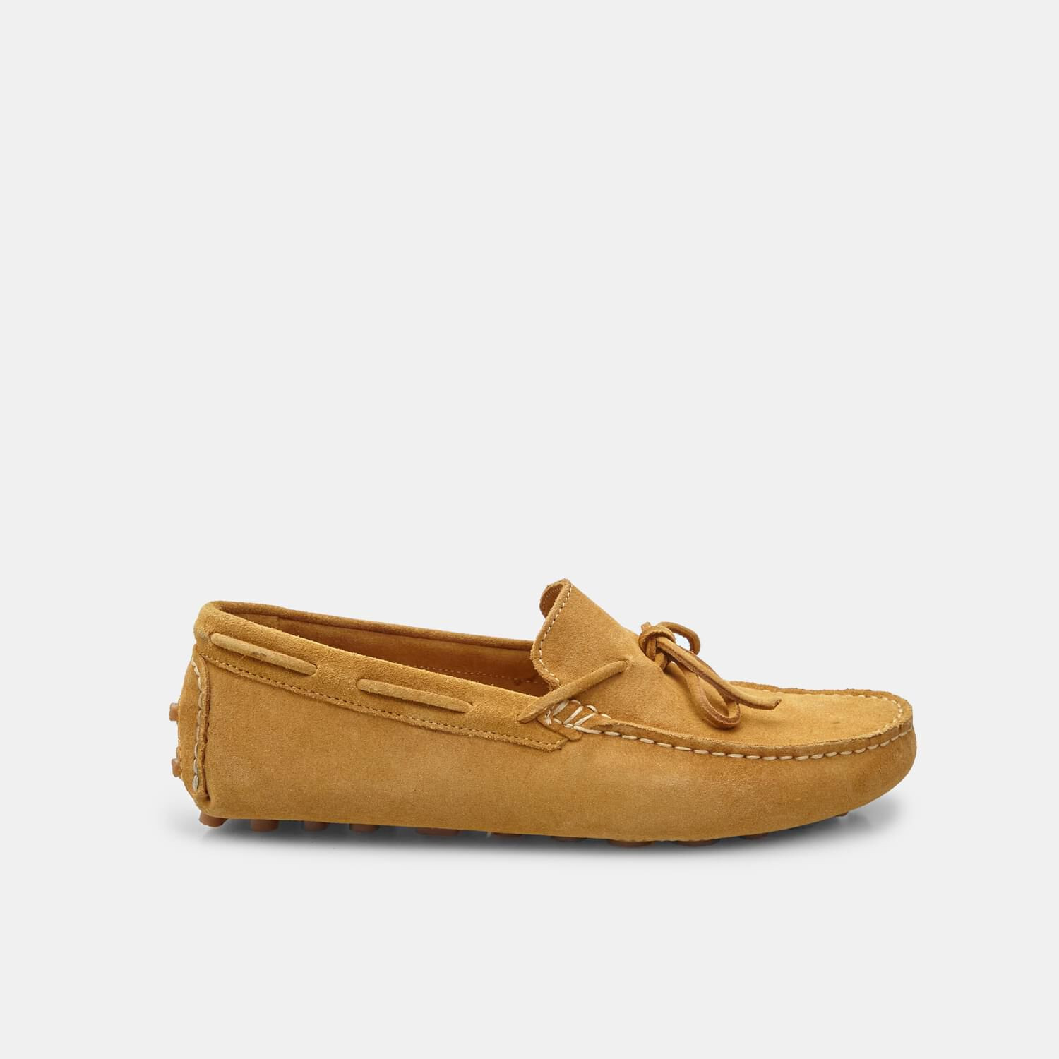 Mocassins pour homme en daim, avec coutures apparentes. Semelle en caoutchouc à crampons.