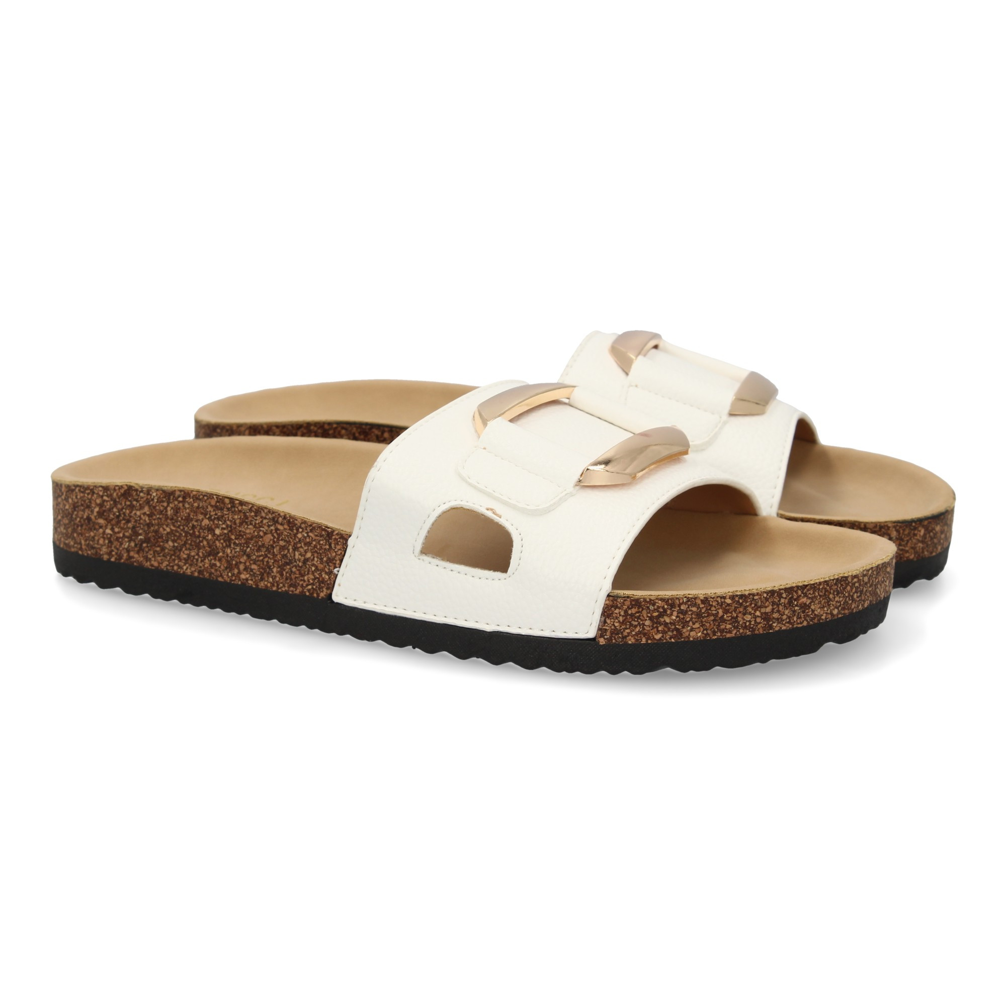 Sandale plate pour femme confortable et élégante, design moderne avec des matières organiques, détail métallique sur la tige, idéale pour le printemps et l'été.